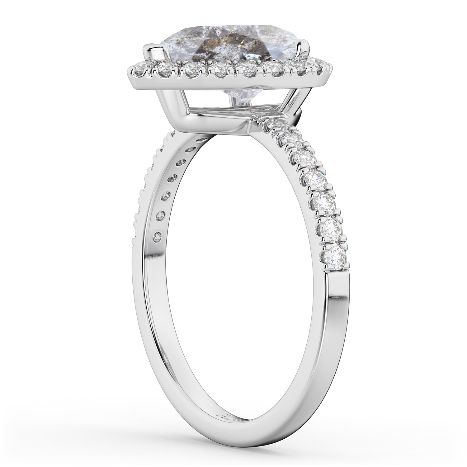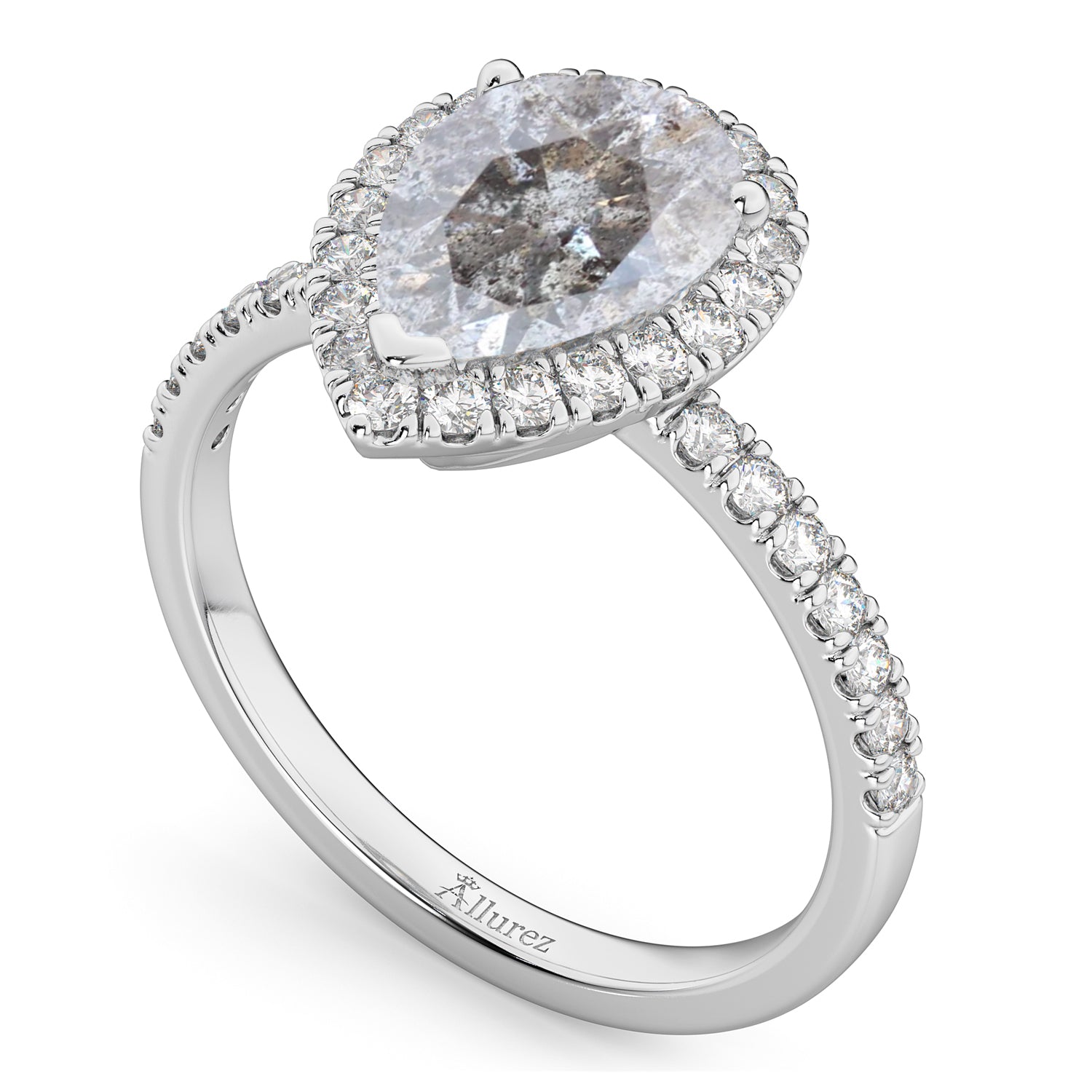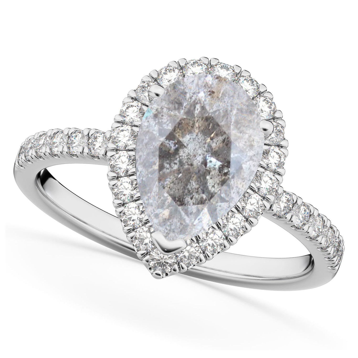 This eye-catching halo diamond ring features 0.51ct total weight of accent diamonds on the thin, 14k white gold band, as well as surrounding a 2.00ct pear cut Salt & Pepper diamond.