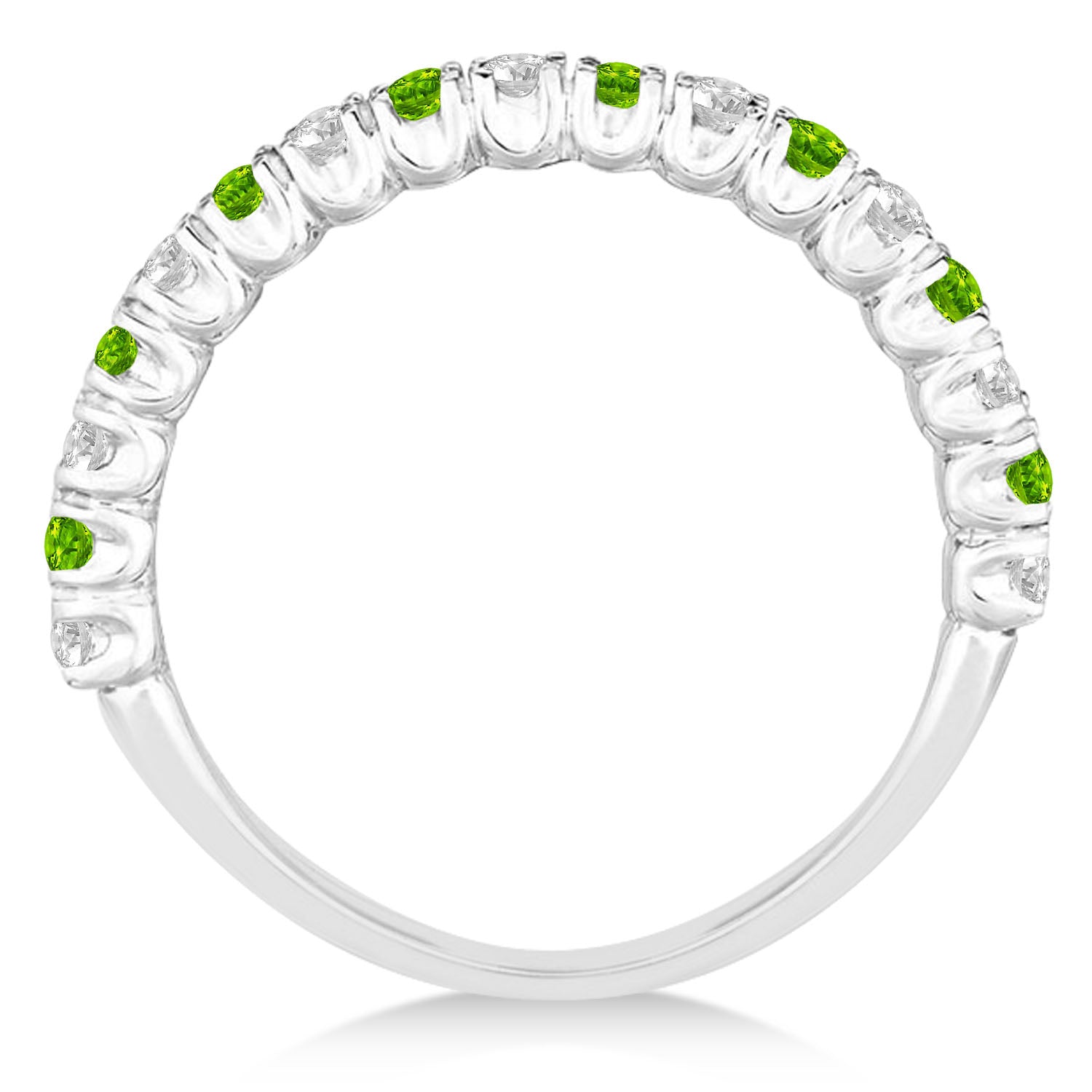 This elegant and modern colored gemstone ring showcases 15 round vibrant natural Amethysts circling halfway around the band. The Green precious stones are set in a sparkling 14k White Gold four-prong setting.