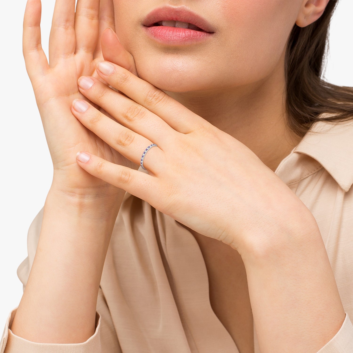 Set in 14k white gold, 24, prong-set, round diamonds and 25, prong-set, round amethysts surround the entirety of the thin wedding band, in a breathtakingly unique style.
