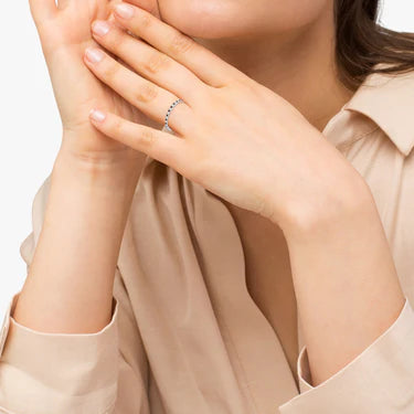 Set in 14k white gold, 24, prong-set, round diamonds and 25, prong-set, round garnets surround the entirety of the thin wedding band, in a breathtakingly unique style.