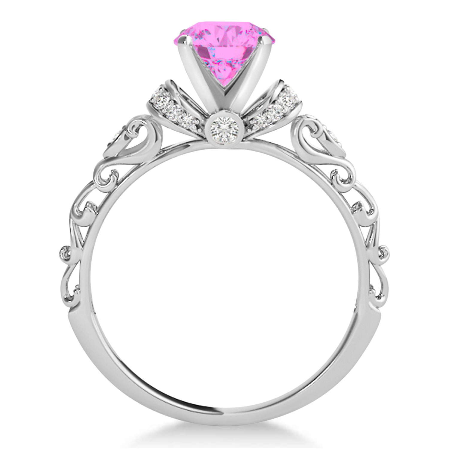 The engagement ring features a pair of diamond-lined "collars" designed to showcase a glittering pink sapphire center stone. Additional accent diamonds are set within the shank's decorative open scrollwork.