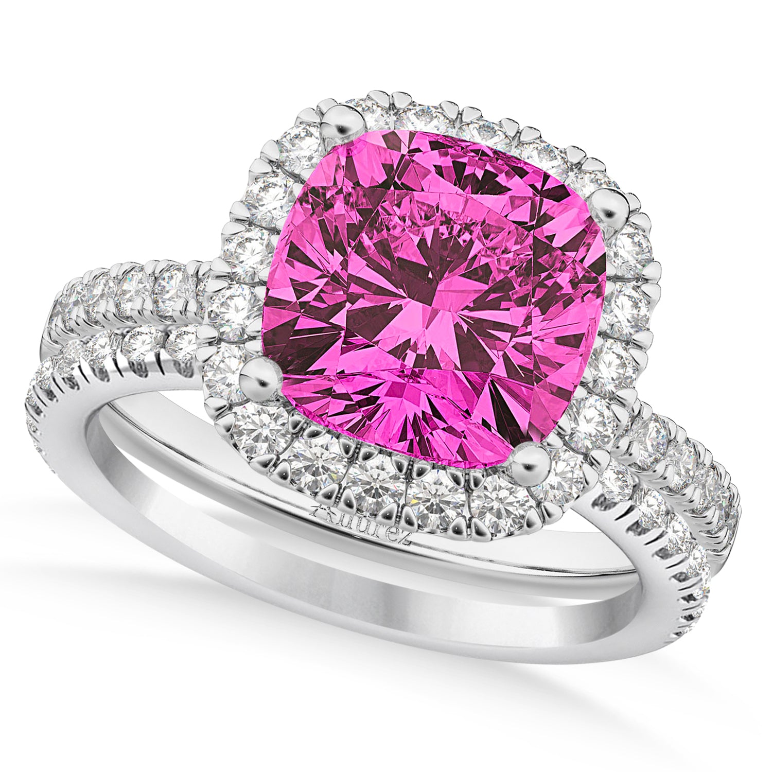 Pink Tourmaline & Diamonds Cushion-Cut Halo Bridal Set 14K White Gold