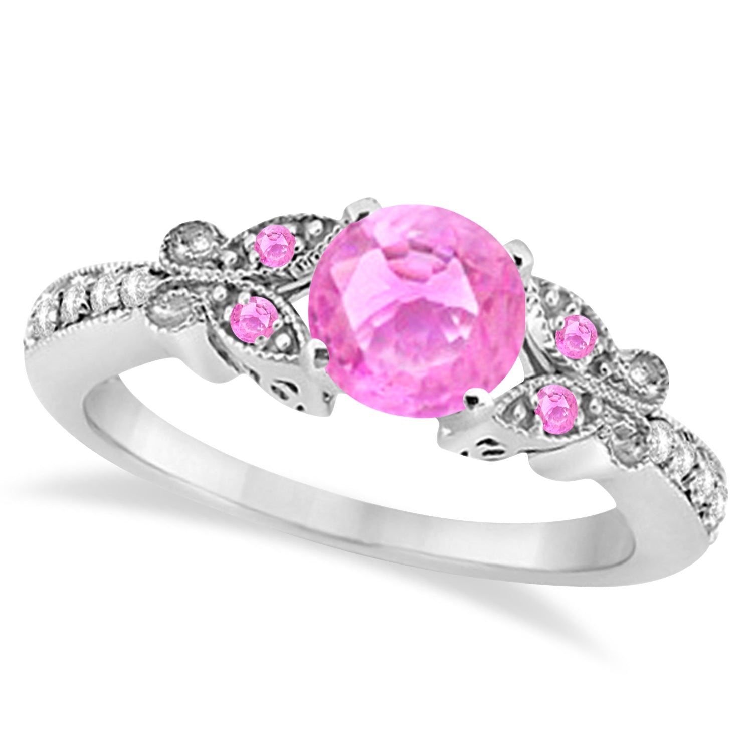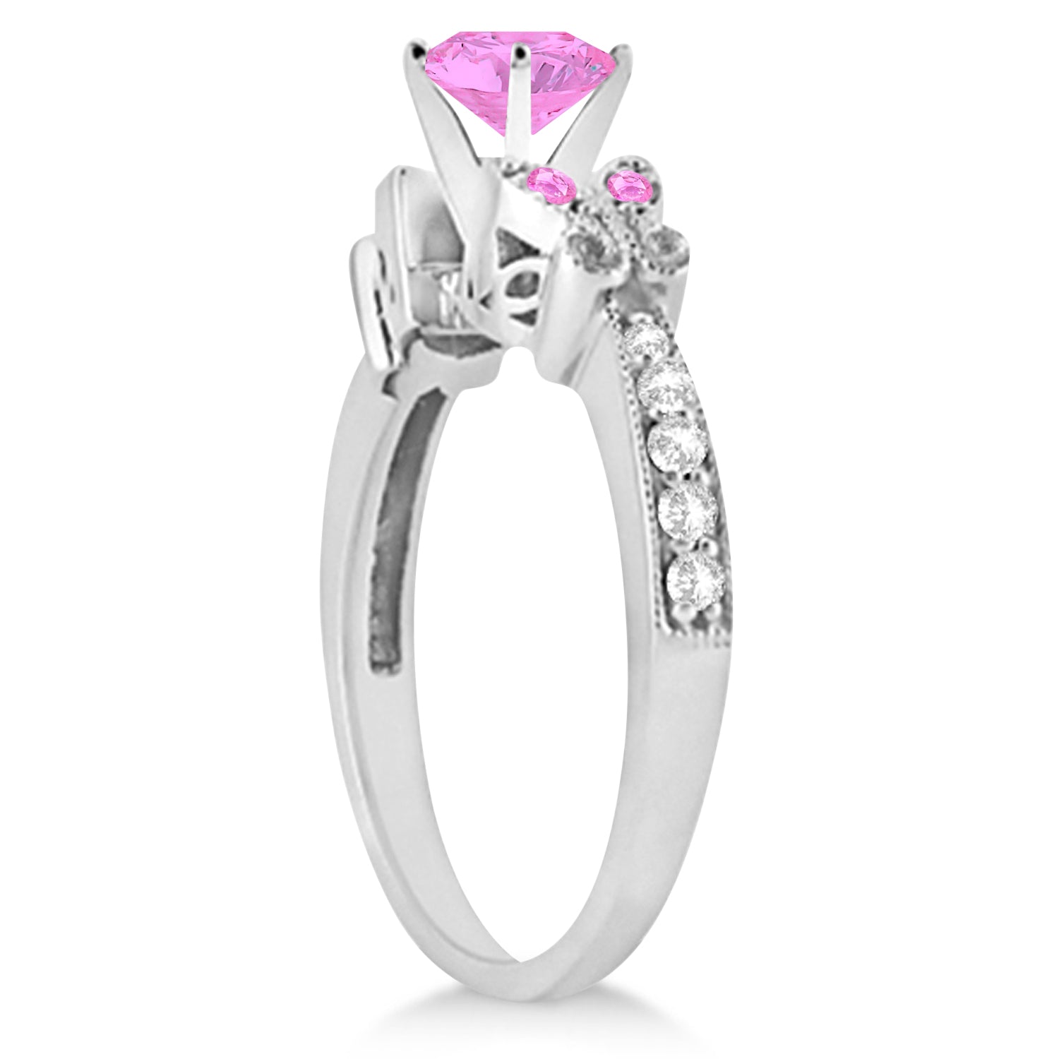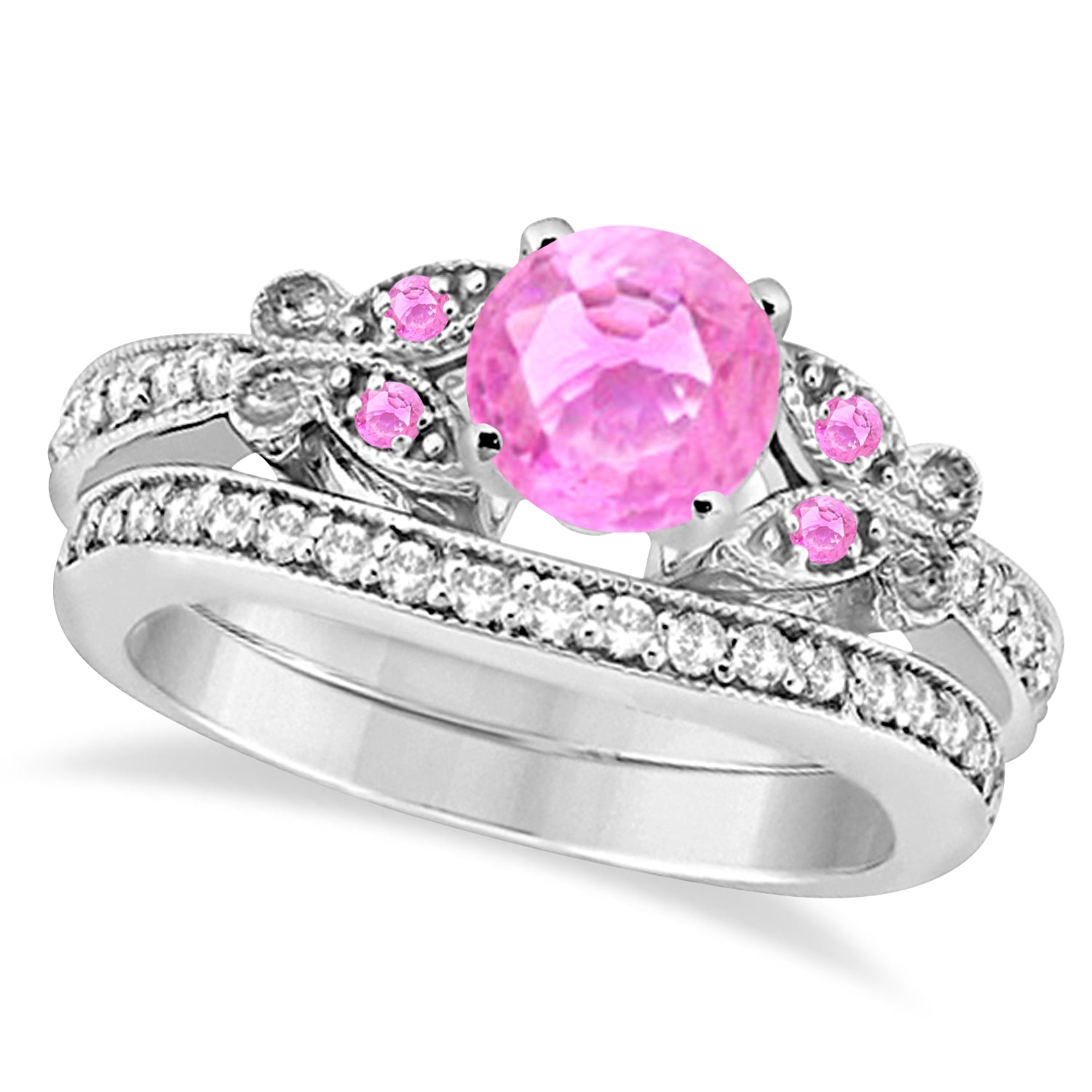This unique engagement ring boasts a 5mm aquamarine center with two artistically created butterfly designs featuring additional aquamarines and a shank of diamonds. Add the curved diamond wedding band and you have the bridal set sure to send her flying.
