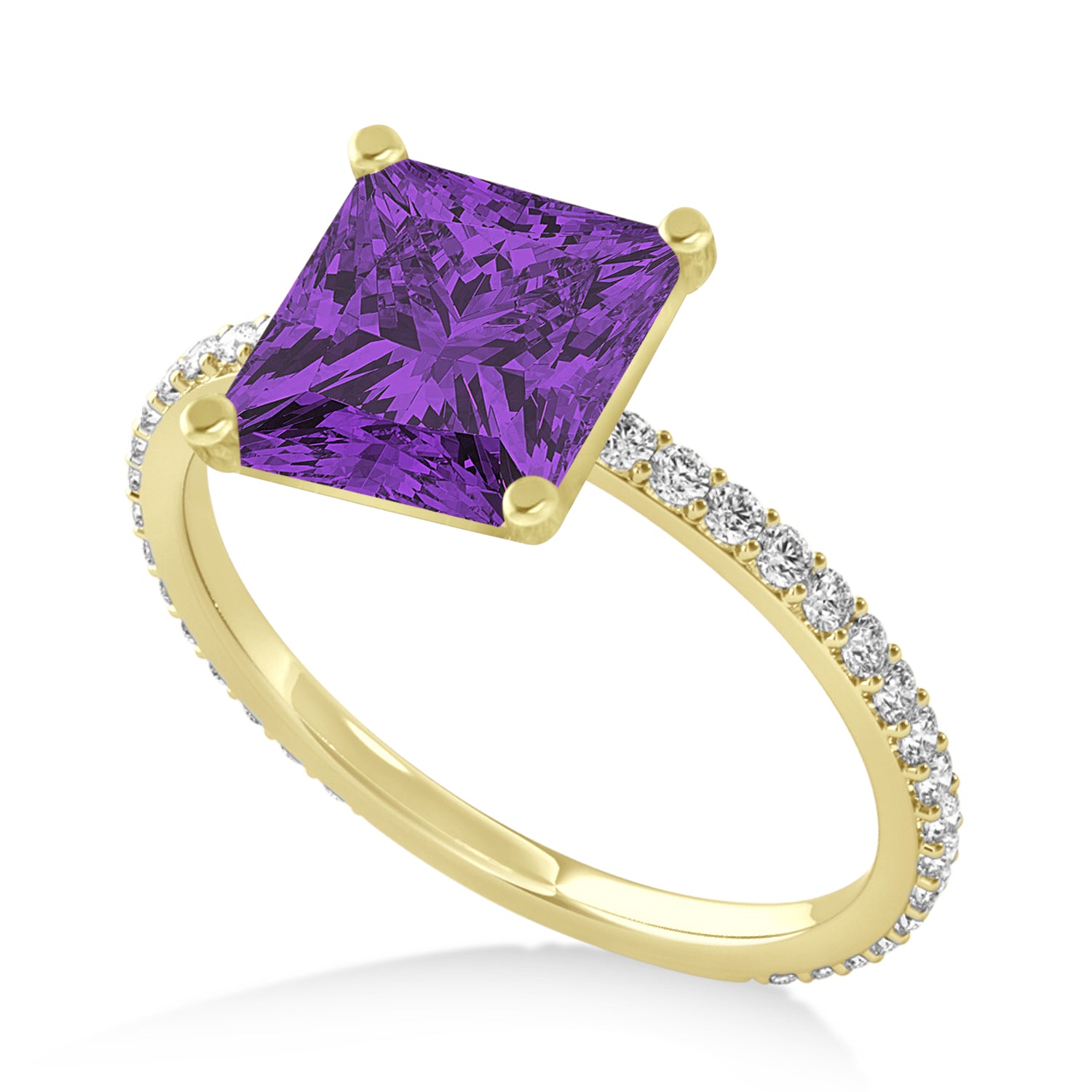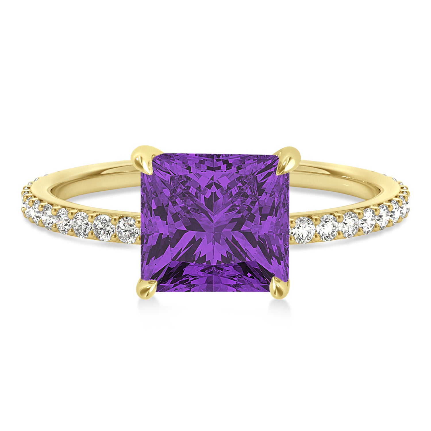 A 0.56 carat Princess-shaped Amethyst is prong set into 14k Yellow Gold in this preset hidden halo engagement ring. An abundance of prong diamond accents are featured in this ring that shine endlessly.
