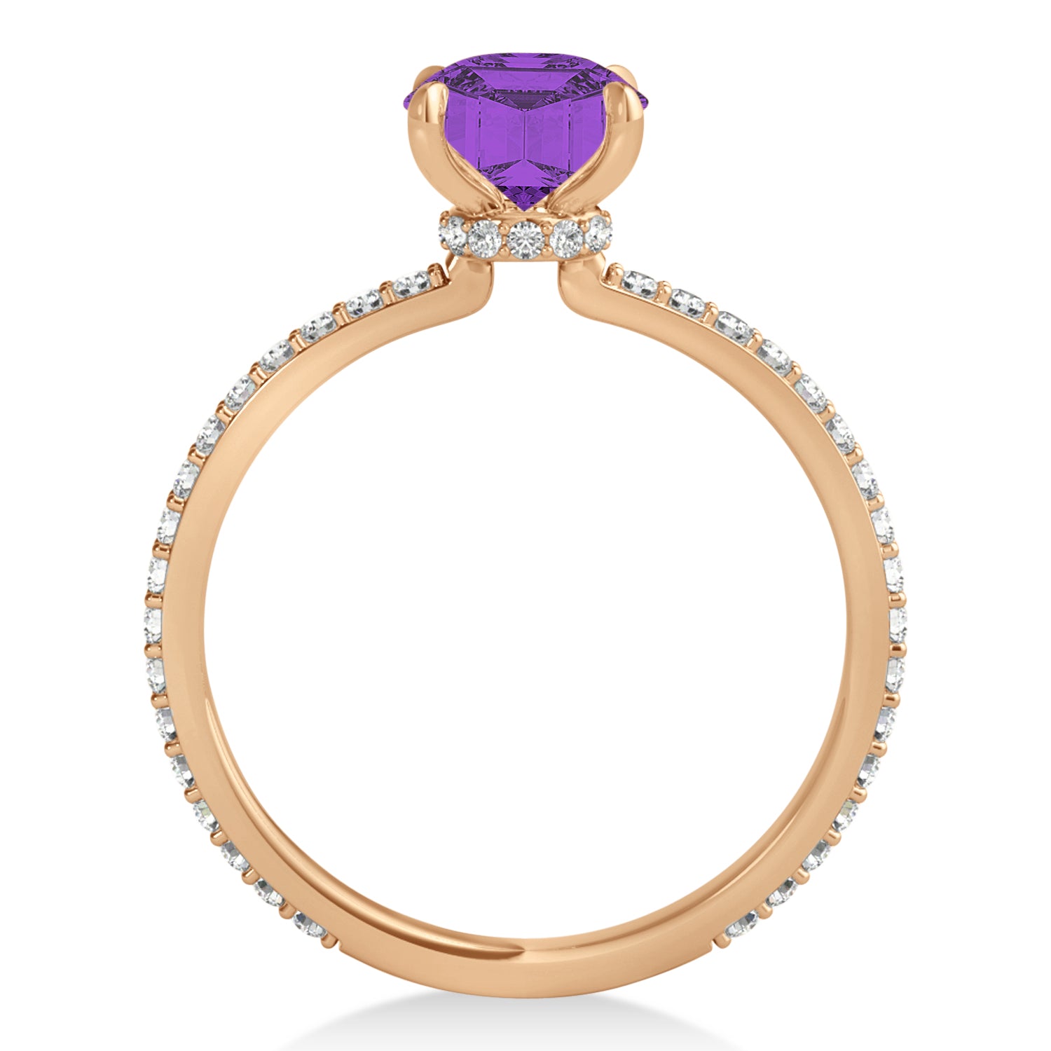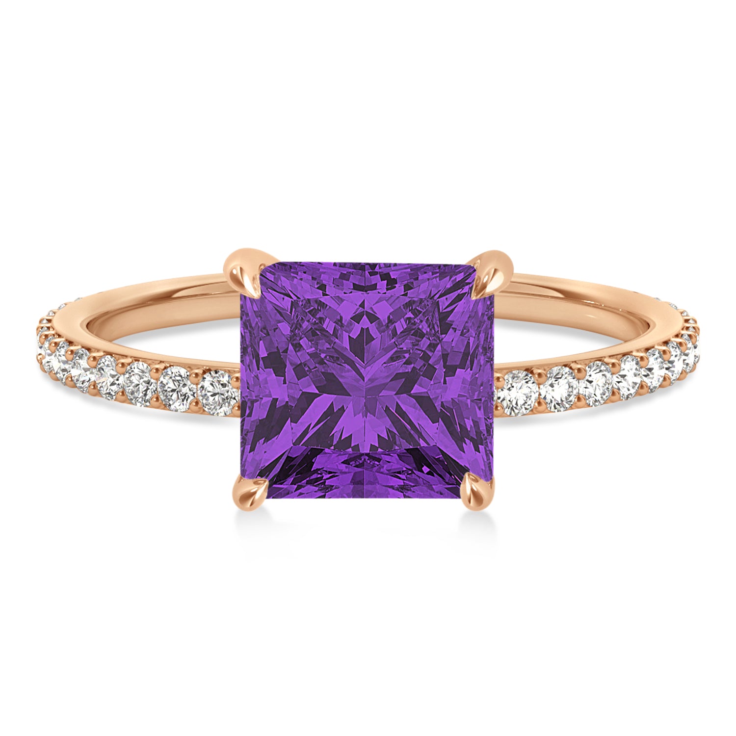 A 0.56 carat Princess-shaped Amethyst is prong set into 18k Rose Gold in this preset hidden halo engagement ring. An abundance of prong diamond accents are featured in this ring that shine endlessly.