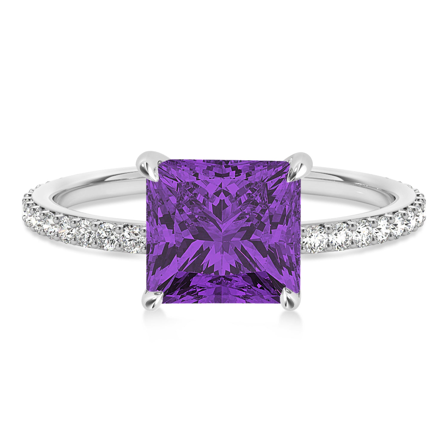 A 0.56 carat Princess-shaped Amethyst is prong set into Platinum in this preset hidden halo engagement ring. An abundance of prong diamond accents are featured in this ring that shine endlessly.