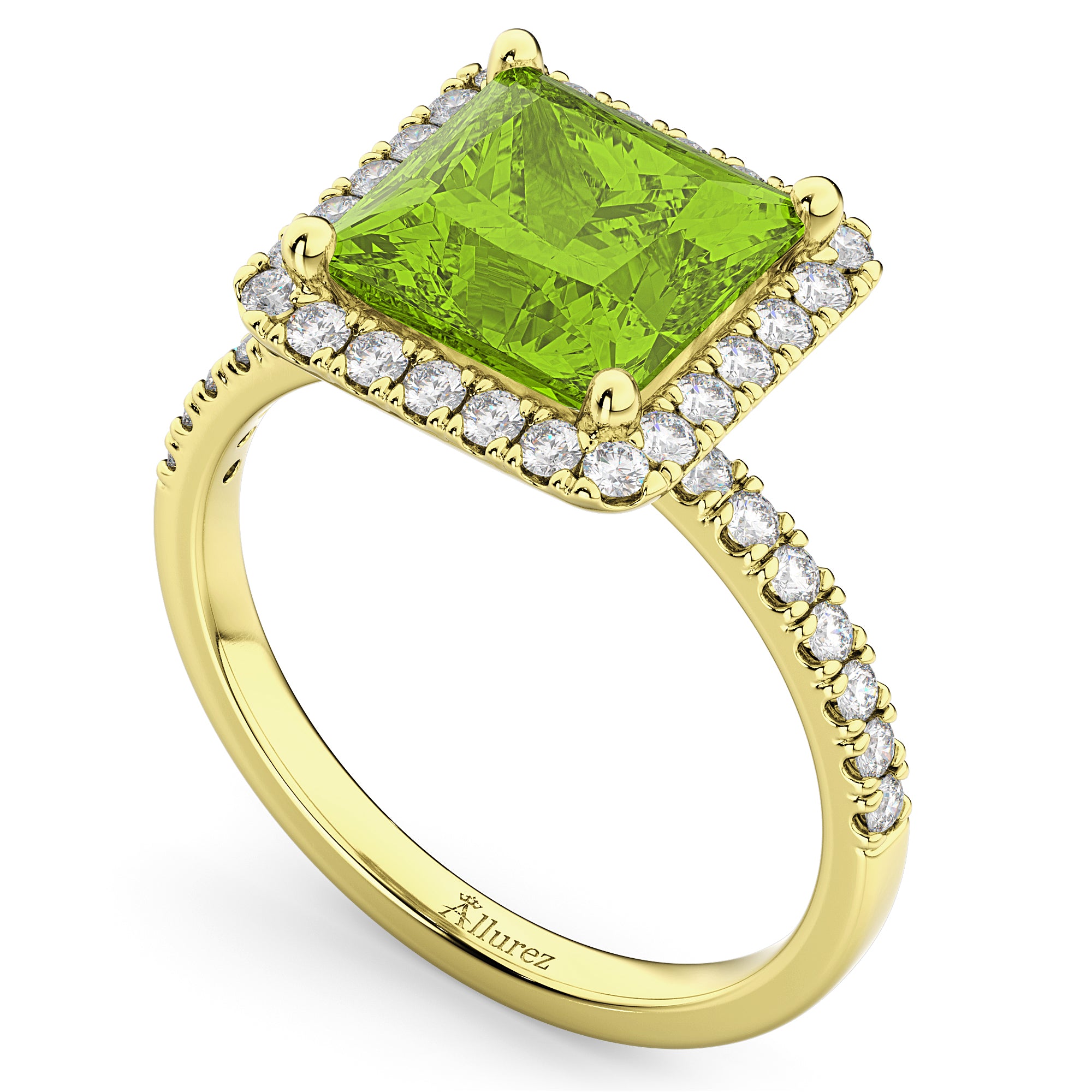 Princess Cut Halo Peridot & Diamond Engagement Ring 14K Yellow Gold 3.47ct
