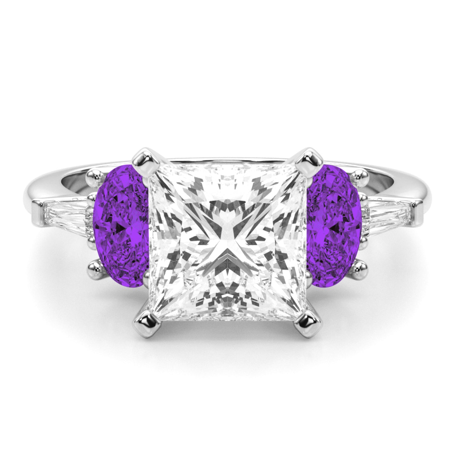 Discover the elegance of the Princess Cut Lab Grown Diamond & Oval Amethyst Engagement Ring, meticulously crafted in 14K White Gold, showcasing a stunning 3.98-carat brilliance. The centerpiece is a breathtaking 3-carat Princess Cut Diamond, surrounded by two oval 0.40-carat amethyst side stones (5.8x4.1mm) and two taper baguette 0.09-carat accent stones (4.02x1.5mm).
