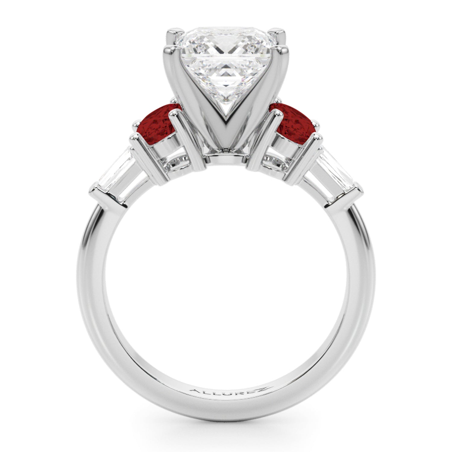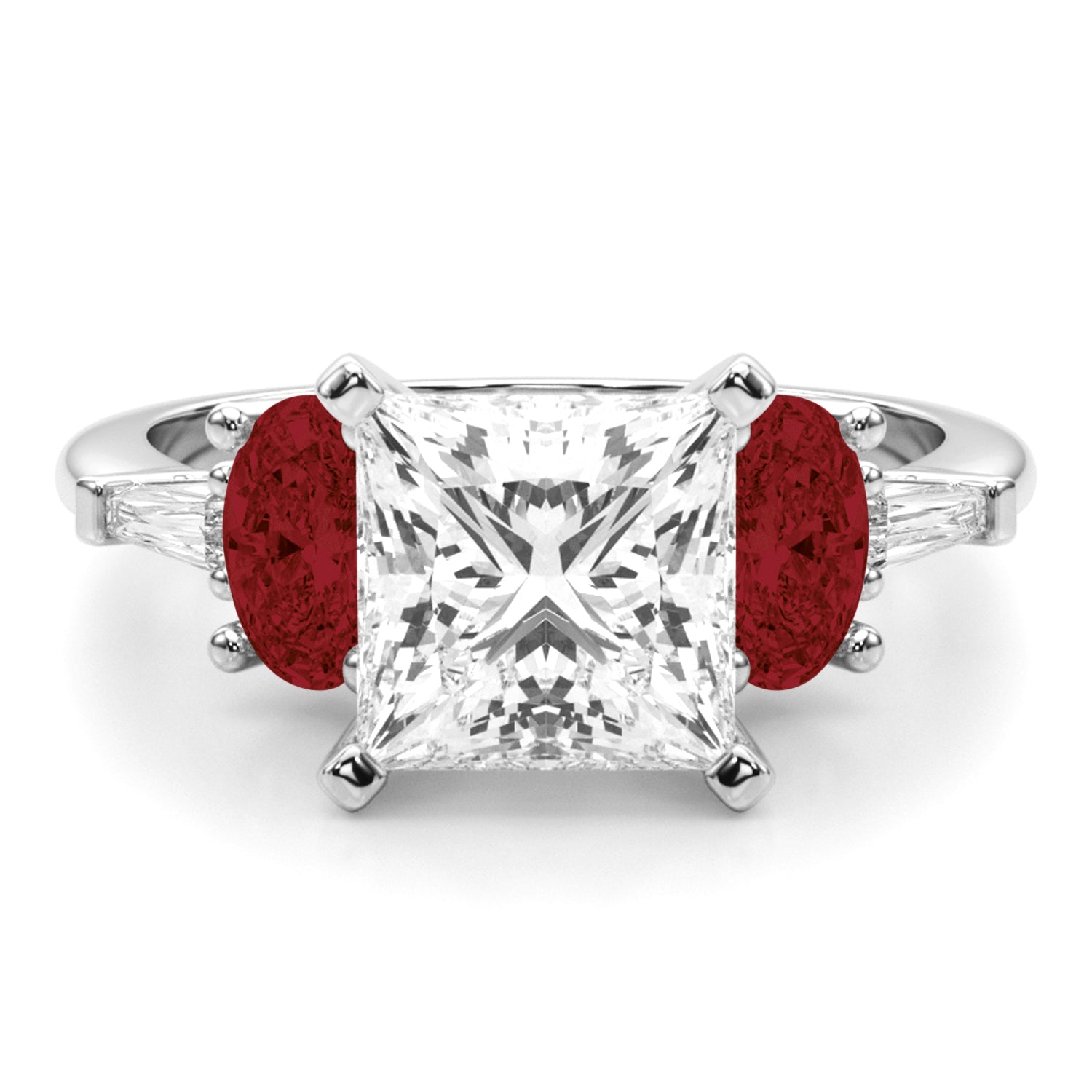Discover the elegance of the Princess Cut Lab Grown Diamond & Oval Garnet Engagement Ring, meticulously crafted in 14K White Gold, showcasing a stunning 4.18-carat brilliance. The centerpiece is a breathtaking 3-carat Princess Cut Diamond, surrounded by two oval 0.50-carat Garnet side stones (5.8x4.1mm) and two taper baguette 0.09-carat accent stones (4.02x1.5mm).
