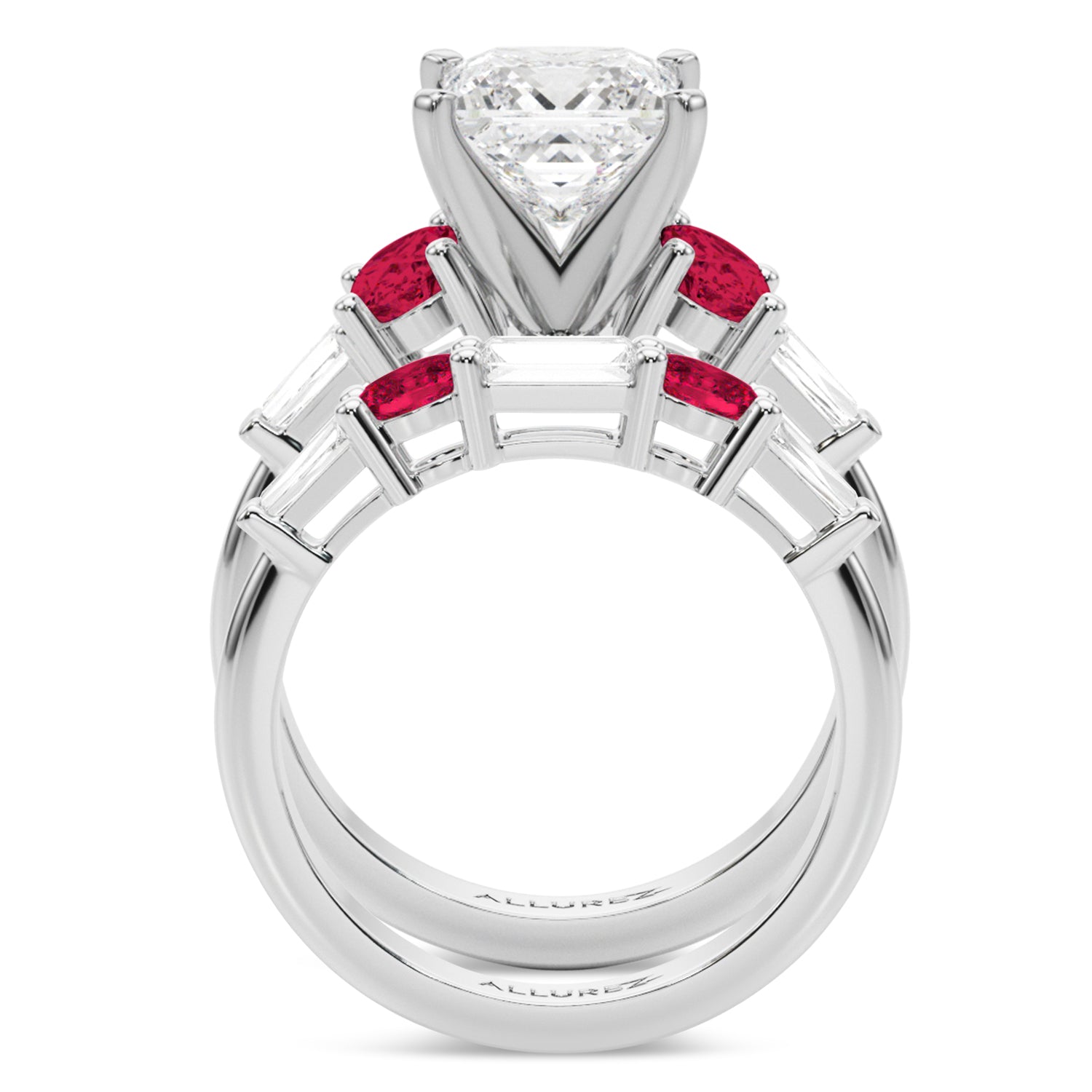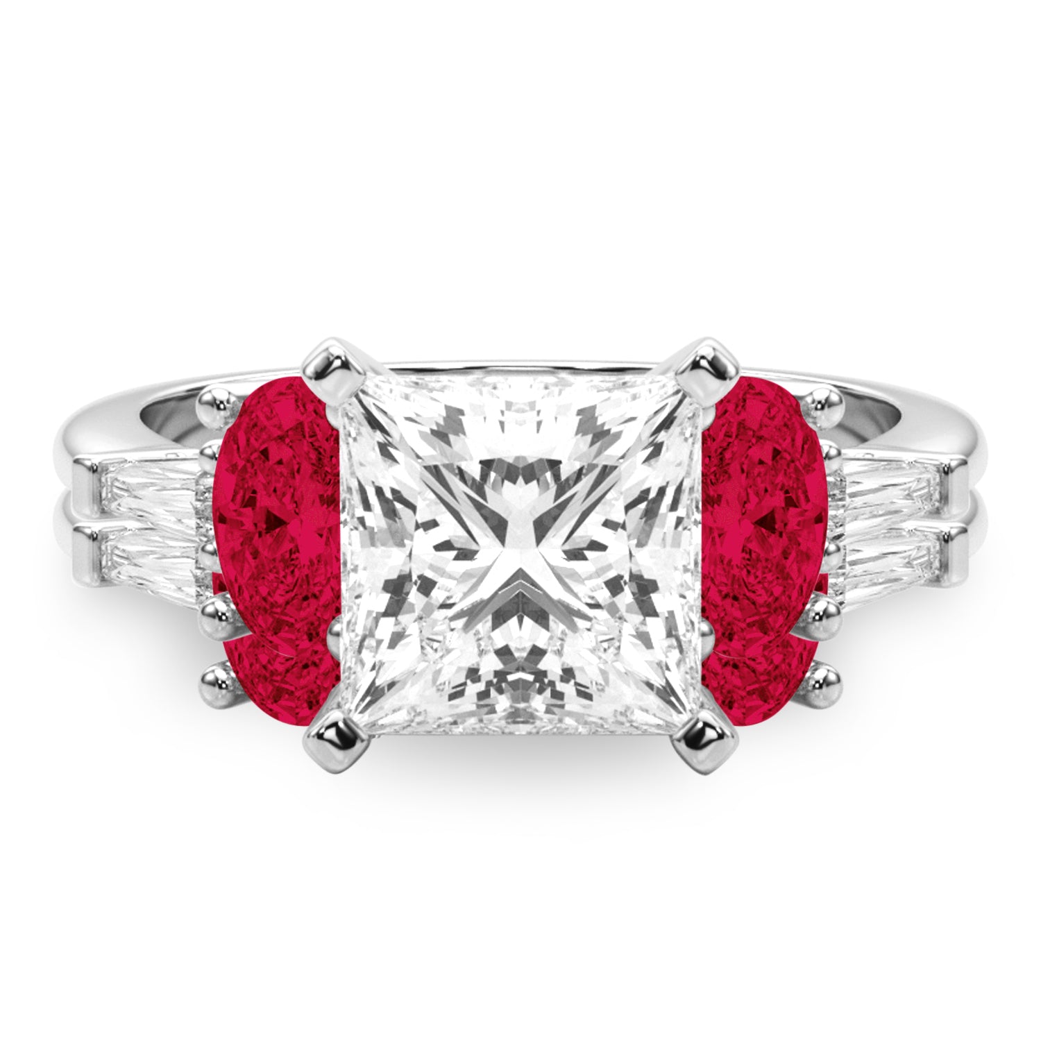 Discover the elegance of the Princess Cut Lab Grown Diamond & Oval Ruby Bridal Set, meticulously crafted in 14K White Gold, showcasing a stunning 5.09-carat brilliance. The centerpiece is a breathtaking 3-carat Princess Cut Diamond, surrounded by two oval 0.53-carat Ruby side stones (5.8x4.1mm) and two taper baguette 0.09-carat accent stones (4.02x1.5mm). The exquisite wedding band showcases a stunning combination of lab grown diamonds, including a Straight Baguette (5x2.5), two delicate Taper Baguettes (4x2x1.5) and two radiant Oval Ruby stones (4x3).