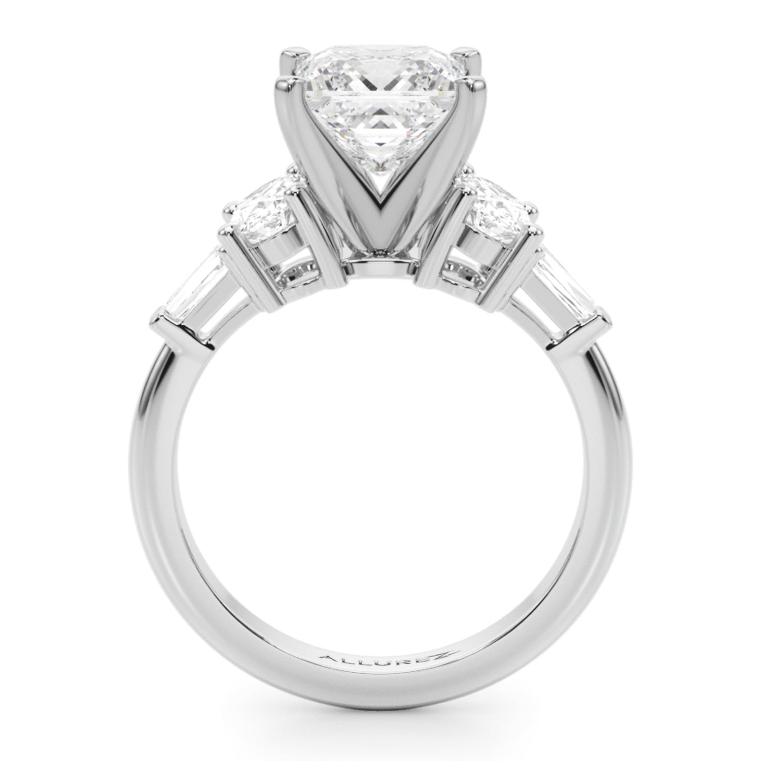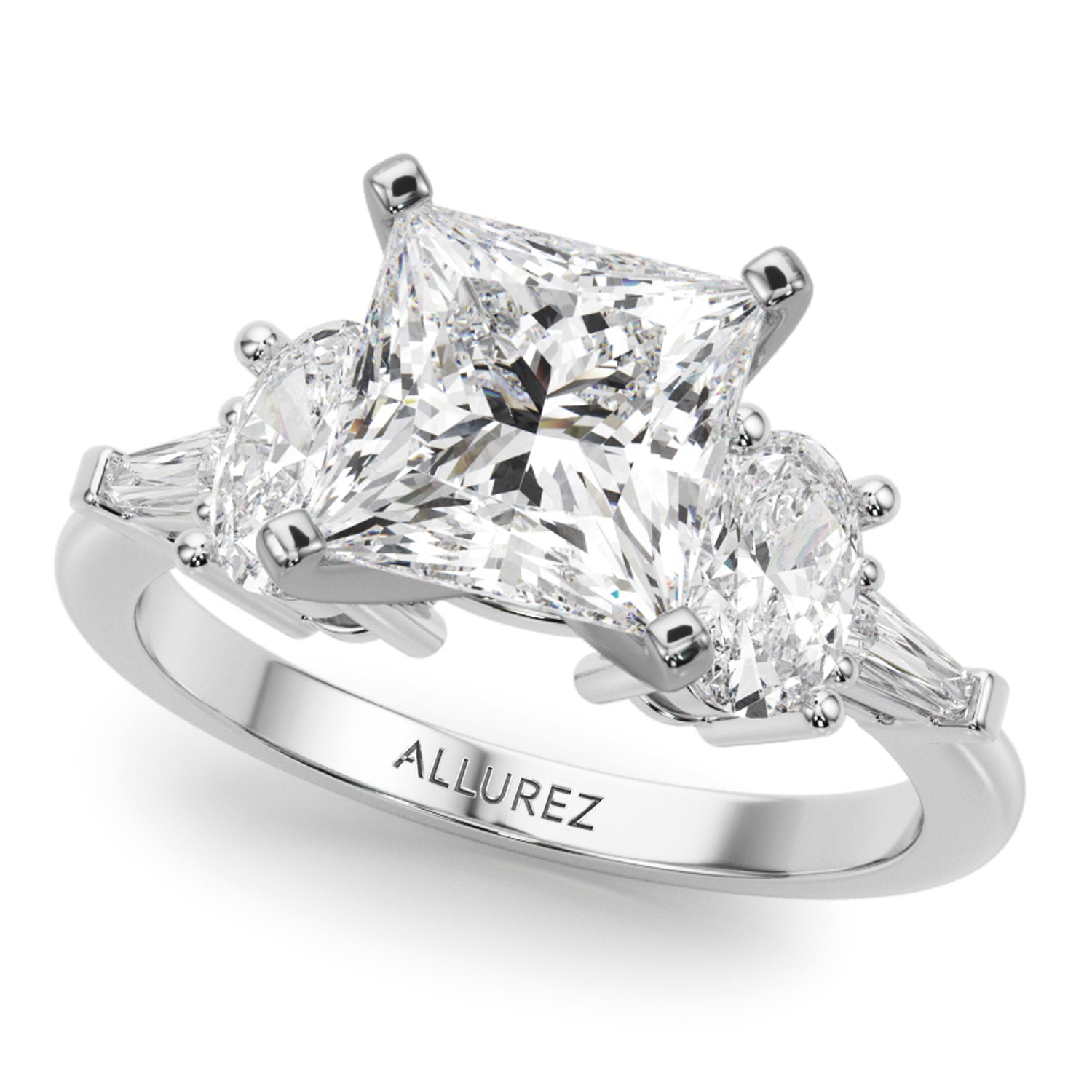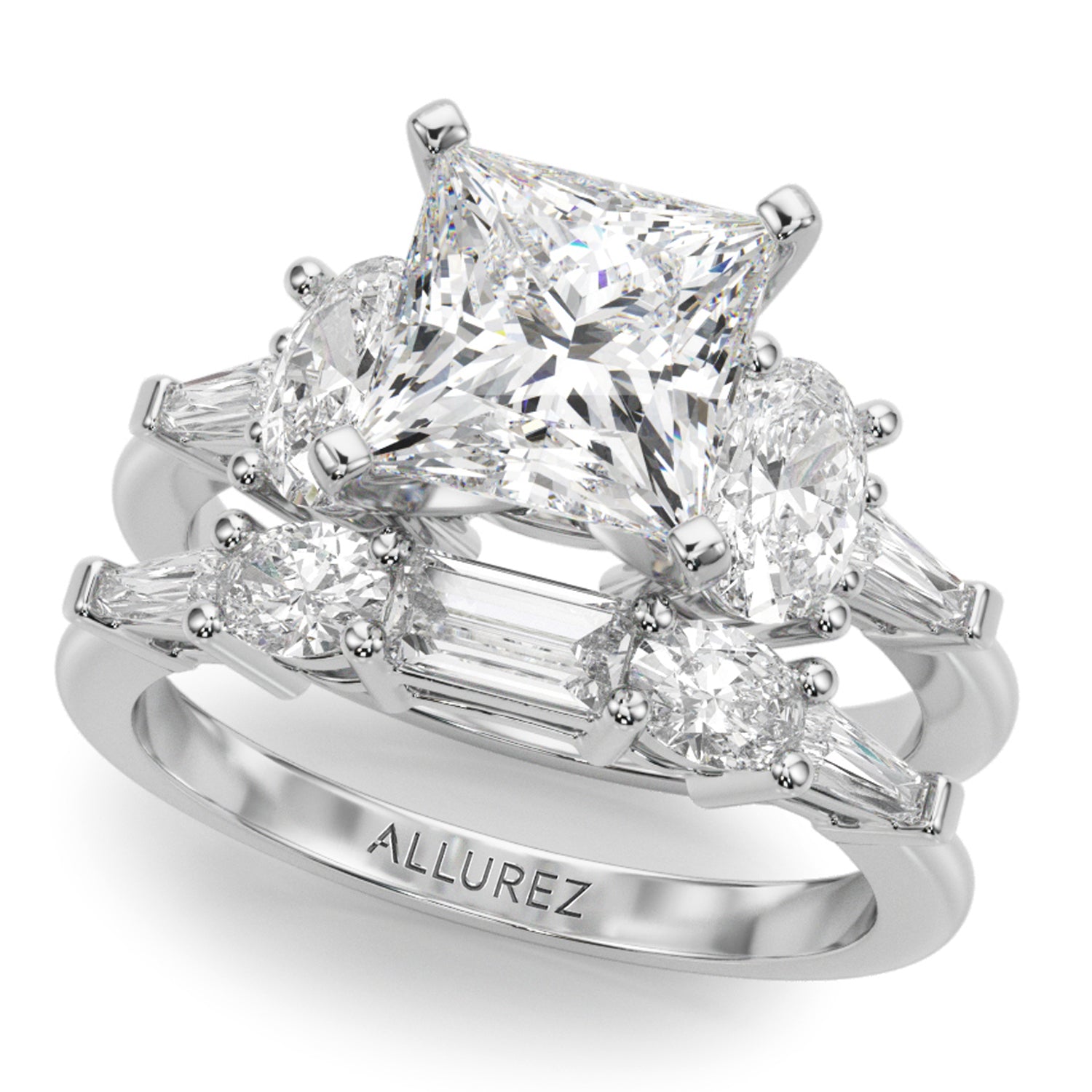 The centerpiece is a breathtaking 3-carat Princess Cut Moissanite diamond, measuring 9.4mm, surrounded by two oval 0.50-carat lab grown diamond side stones (5.8x4.1mm) and two taper baguette 0.09-carat lab grown diamond accent stones (4.02x1.5mm). And the exquisite Wedding Band piece showcases a stunning combination of a Straight Baguette (5x2.5), two radiant Oval stones (4x3), and two delicate Taper Baguettes (4x2x1.5)