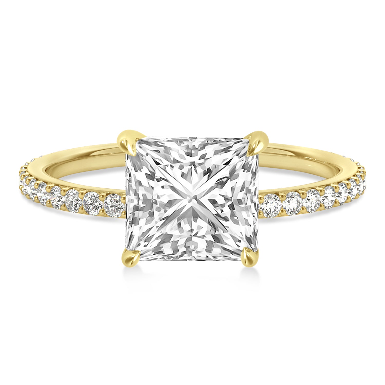 A 0.56 carat Princess-shaped diamond is prong set into 14k Yellow Gold in this preset hidden halo engagement ring. An abundance of prong diamond accents are featured in this ring that shine endlessly.
