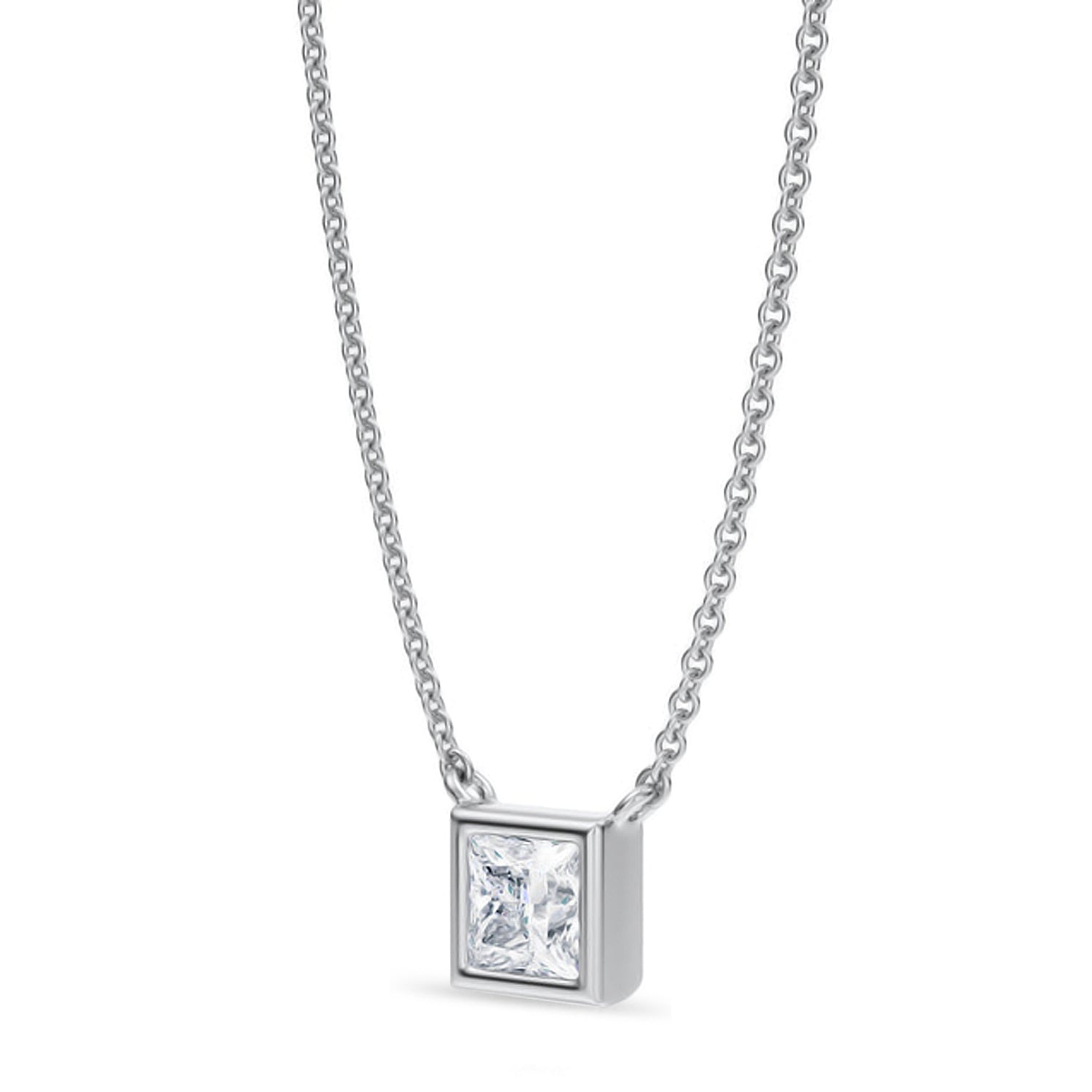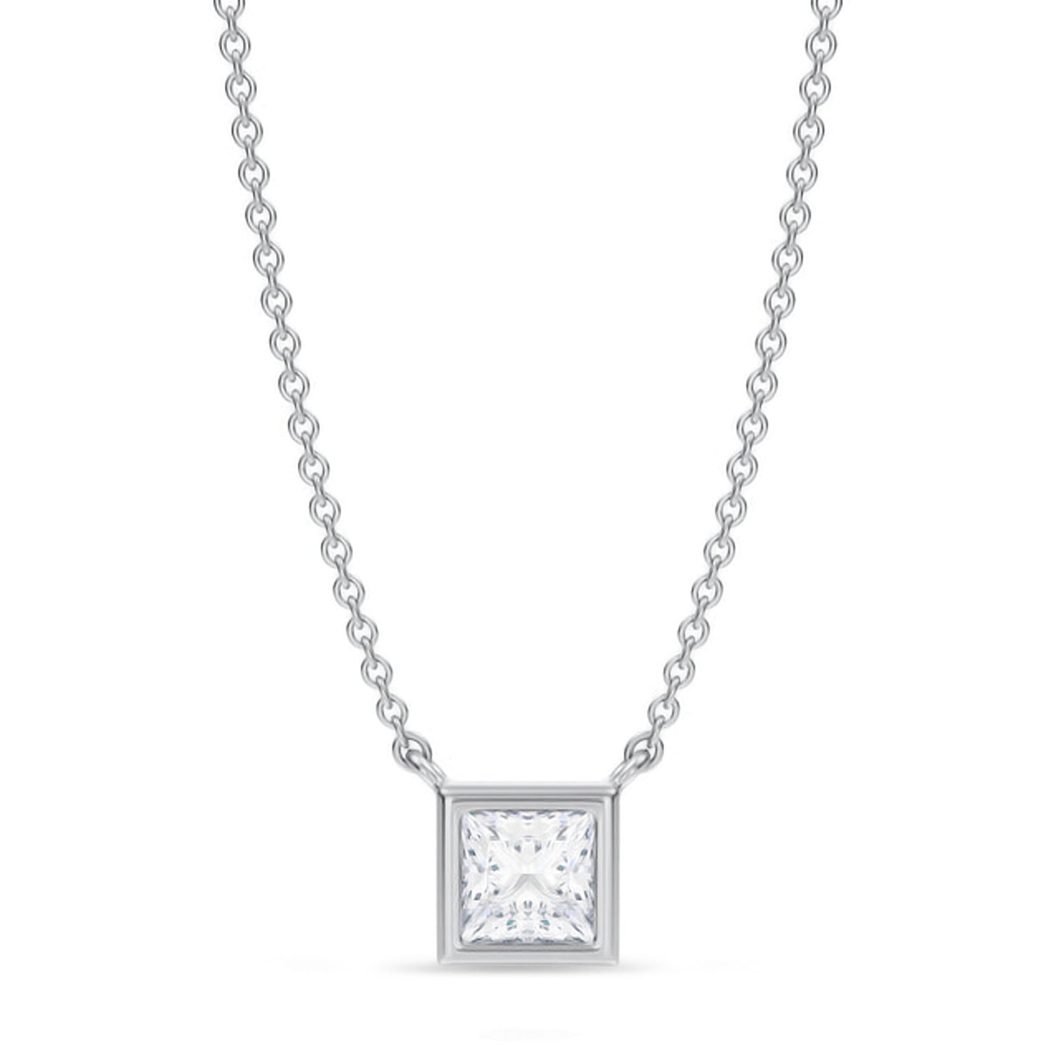 Embrace effortless elegance with this 0.50 carat Princess Lab Diamond Solitaire Pendant Necklace in 14K white gold. The crisp edges and radiant facets of the princess cut in a bezel setting create a bold yet refined sparkle. Set in a sleek, minimalist design, it is perfect for both daily wear and special moments. A modern classic that adds brilliance to any jewelry collection.