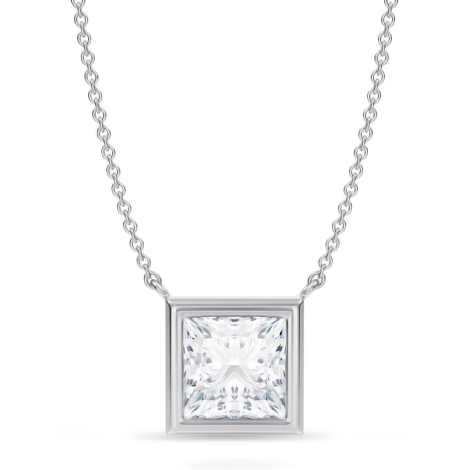 Turn heads with this 3.00 carat Princess Lab Diamond Solitaire Pendant Necklace in 14K white gold. The crisp geometry and intense sparkle of the princess cut in a bezel setting create a powerful visual impact. Expertly crafted to combine elegance and strength, this pendant is a bold addition to any fine jewelry wardrobe. A flawless fusion of brilliance and style.
