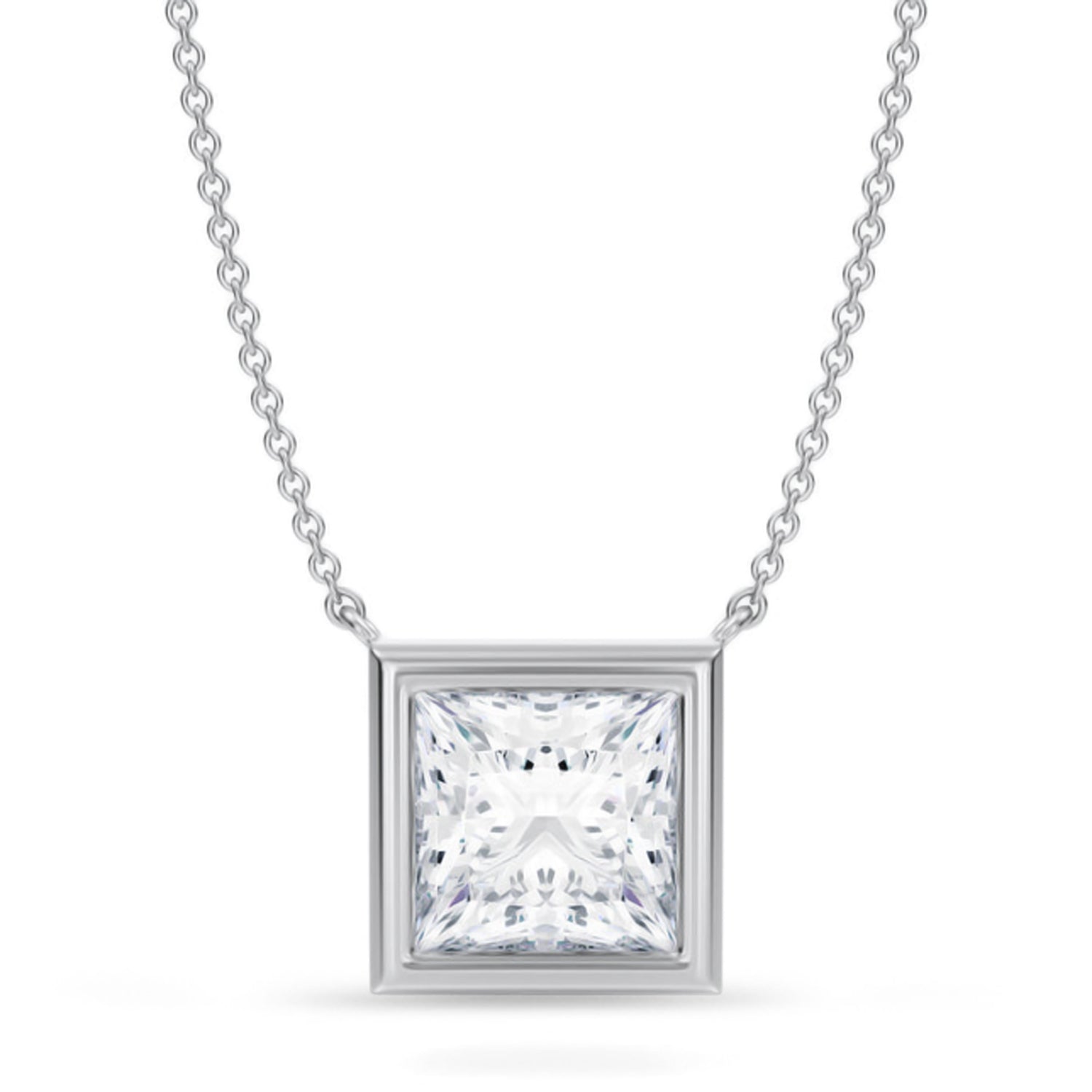 Crafted to captivate, this 3.50 carat Princess Lab Diamond Solitaire Pendant Necklace in 14K white gold radiates with modern brilliance. The striking princess cut in a bezel setting delivers clean lines and dazzling light reflection, making it a standout piece. Perfect for those who appreciate bold elegance and lasting beauty.