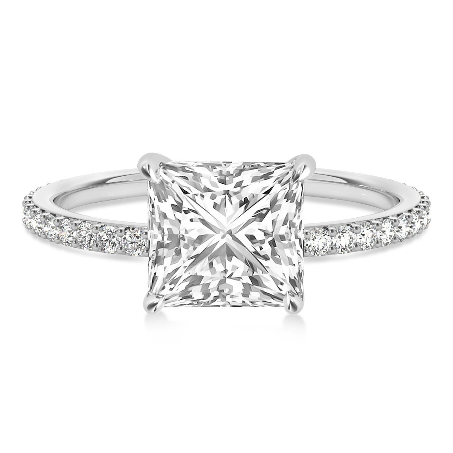 A 0.56 carat Princess-shaped lab grown diamond is prong set into 14k White Gold in this preset hidden halo engagement ring. An abundance of prong lab grown diamond accents are featured in this ring that shine endlessly.