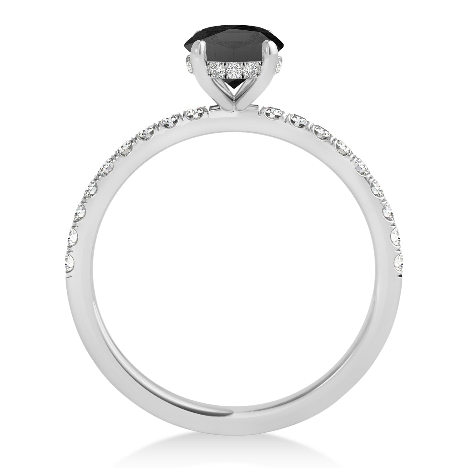 A 0.56 carat princess-shaped Onyx is prong set into 18k White Gold in this preset hidden halo engagement ring. An abundance of prong diamond accents are featured in this ring that shine endlessly.