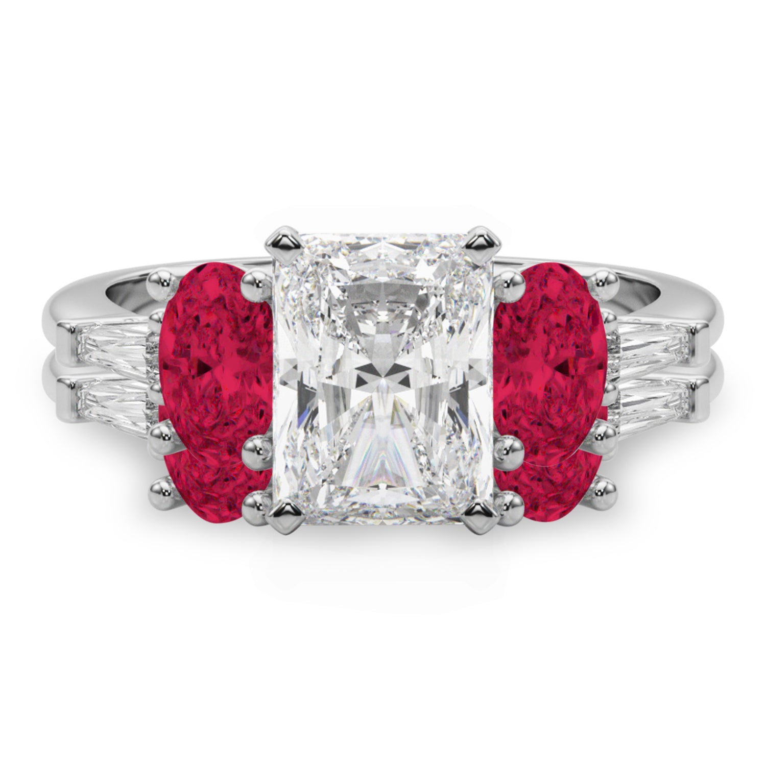 Discover the elegance of the Radiant Lab Grown Diamond & Oval Ruby Bridal Set, meticulously crafted in 14K White Gold, showcasing a stunning 5.09-carat brilliance. The centerpiece is a breathtaking 3-carat Radiant Diamond, surrounded by two oval 0.53-carat Ruby side stones (5.8x4.1mm) and two taper baguette 0.09-carat accent stones (4.02x1.5mm). The exquisite wedding band showcases a stunning combination of lab grown diamonds, including a Straight Baguette (5x2.5), two delicate Taper Baguettes (4x2x1.5) and two radiant Oval Ruby stones (4x3).
