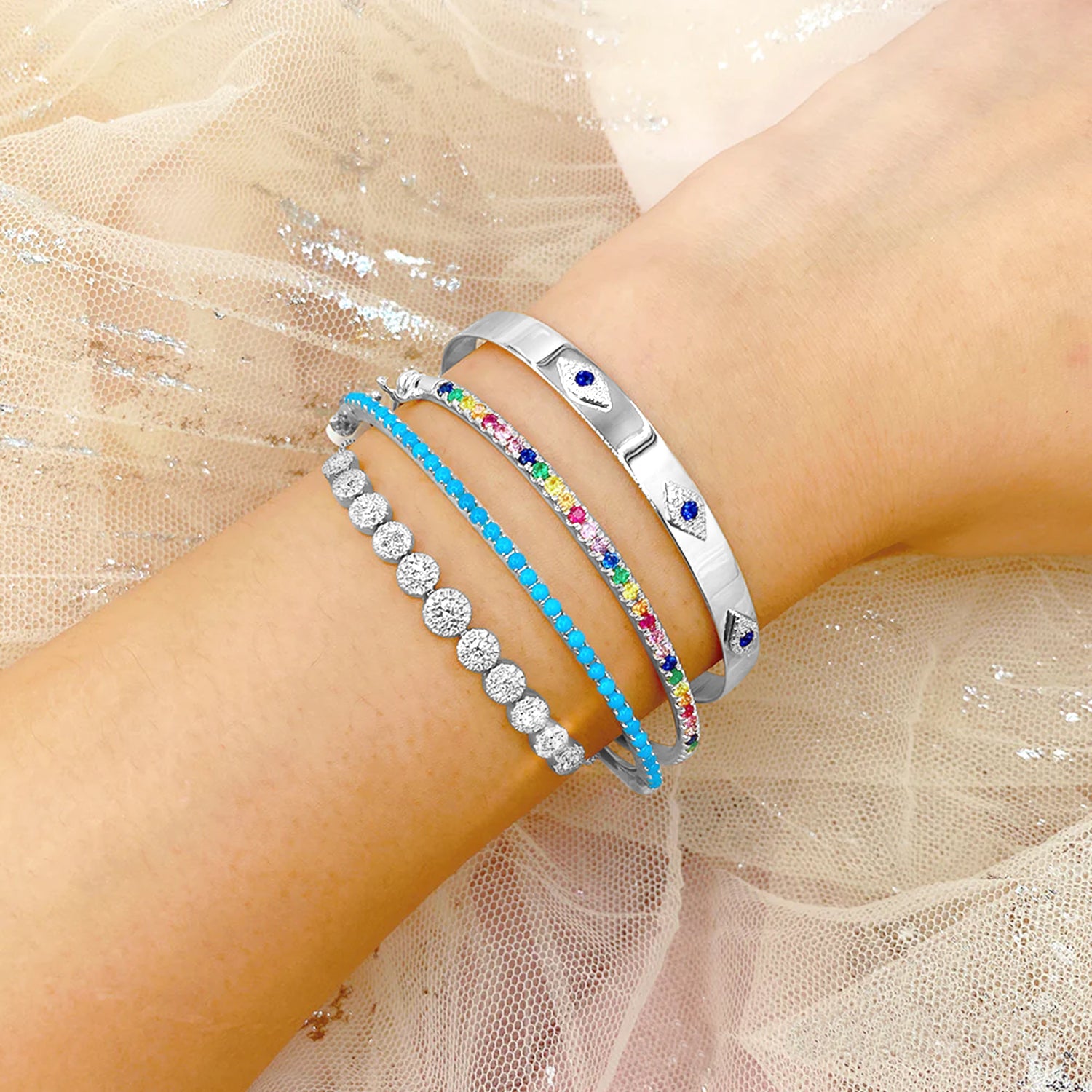 Introducing our enchanting Rainbow Colored Gemstone Pave Bracelet in 14k White Gold (1.18ct), a mesmerizing piece that radiates beauty and grace. This exquisite bangle bracelet features a lustrous 14k white gold band adorned with a dazzling array of multi-colored gemstones totaling 1.18 carats. The vibrant hues of amethyst, citrine, peridot, blue topaz, and garnet create a captivating display of color, making this bracelet a true statement piece that effortlessly adds a touch of elegance and sophistication to any ensemble.