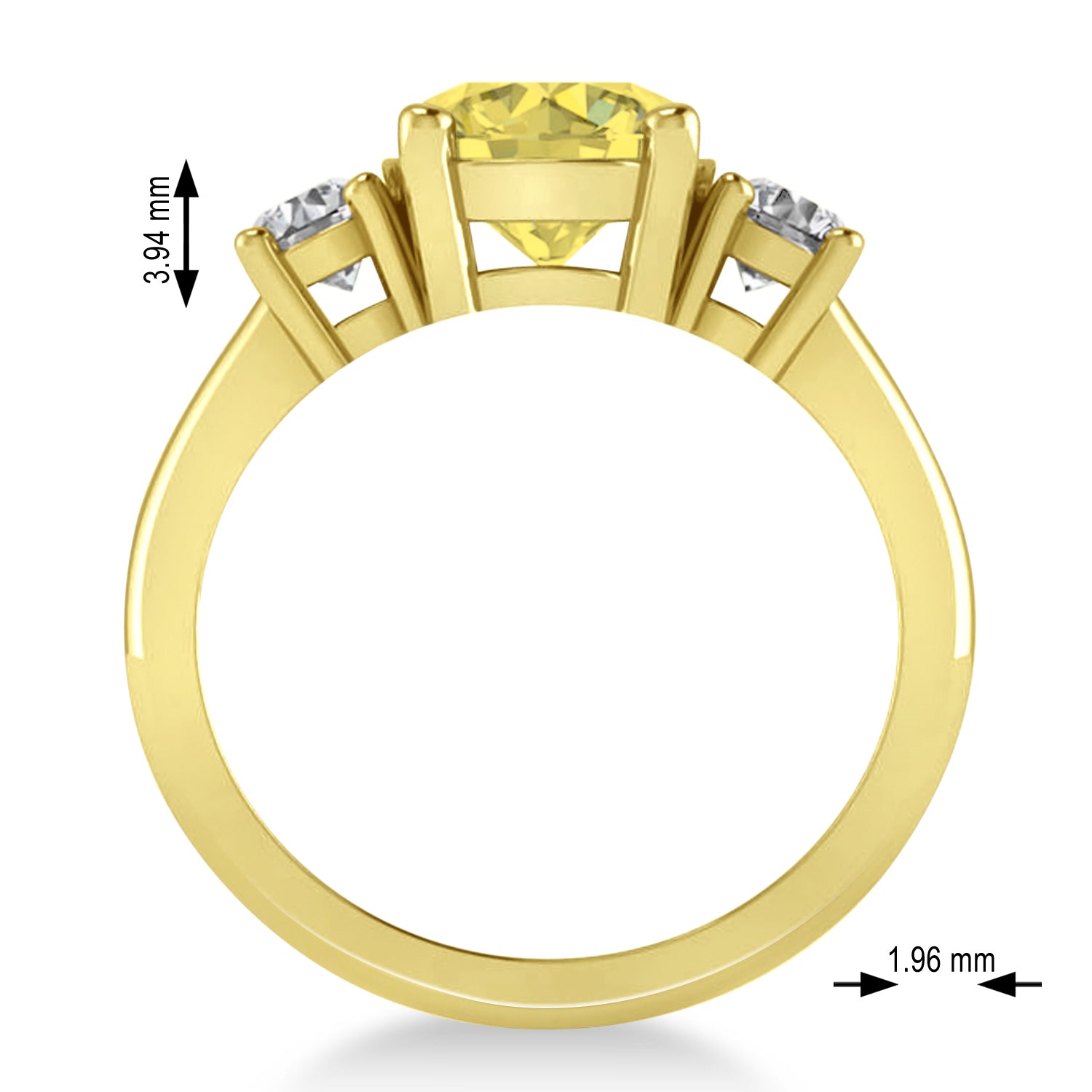 All diamonds are prong set with a combined 2.50 total carat weight. White diamonds are rated G-H for color and SI1-SI2 for clarity; the yellow diamond is of eye clean clarity.