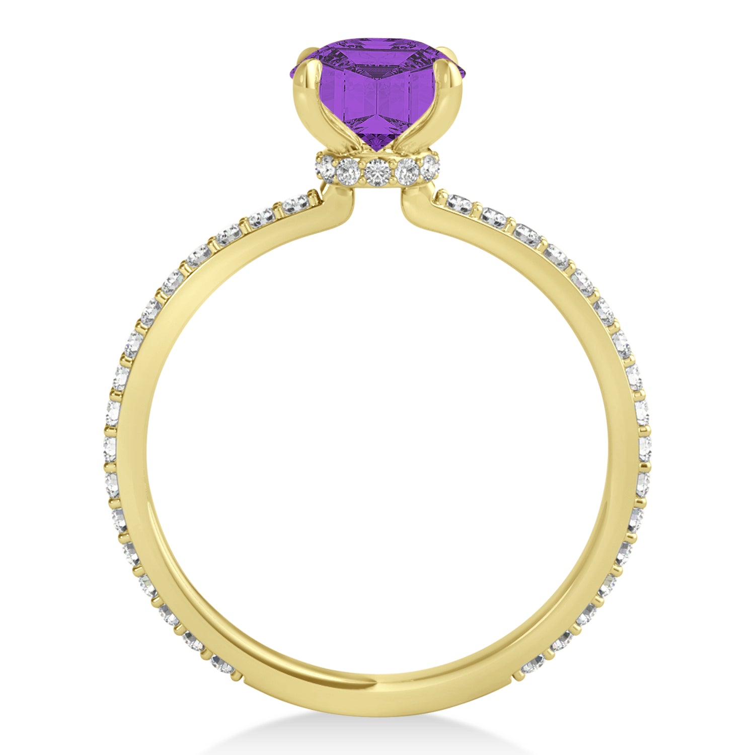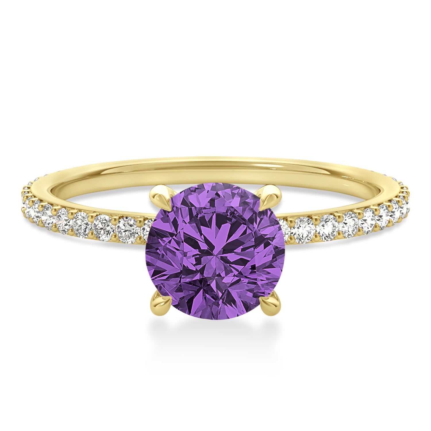A 1.35 carat round-shaped Amethyst is prong set into 18k Yellow Gold in this preset hidden halo engagement ring. An abundance of prong diamond accents are featured in this ring that shine endlessly.