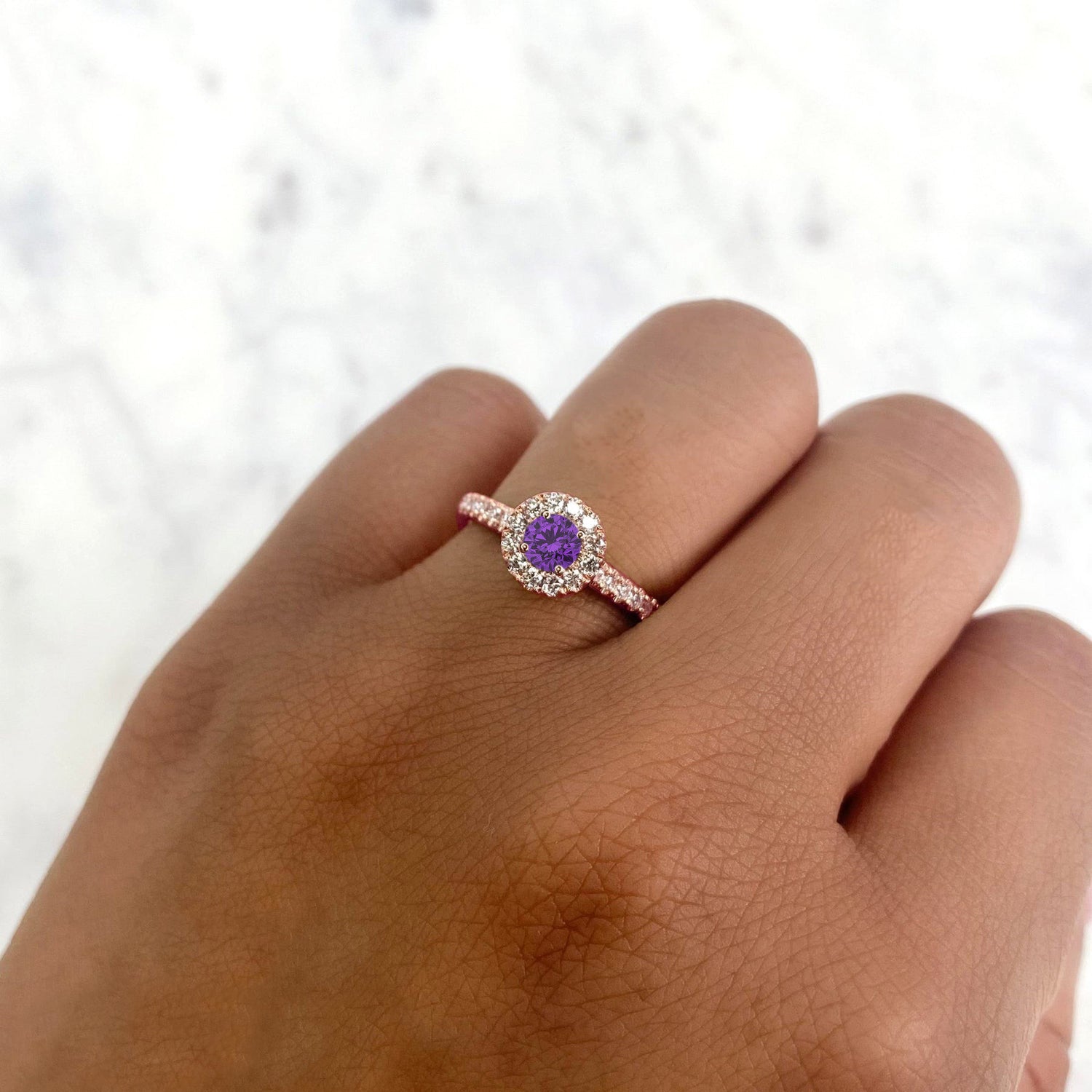 Embark on a journey of romance with our Round Amethyst Solitaire & Diamond Engagement Ring in 14K Rose Gold (0.56ct). This enchanting ring showcases a mesmerizing Round amethyst, radiating a regal purple hue, at its core. Surrounded by a sparkling halo of diamonds, the centerpiece exudes timeless elegance and sophistication. Meticulously crafted in lustrous 14K rose gold, this engagement ring is a symbol of enduring love and refined beauty. The carefully designed band ensures a comfortable fit, adding to the overall allure of this exquisite piece.