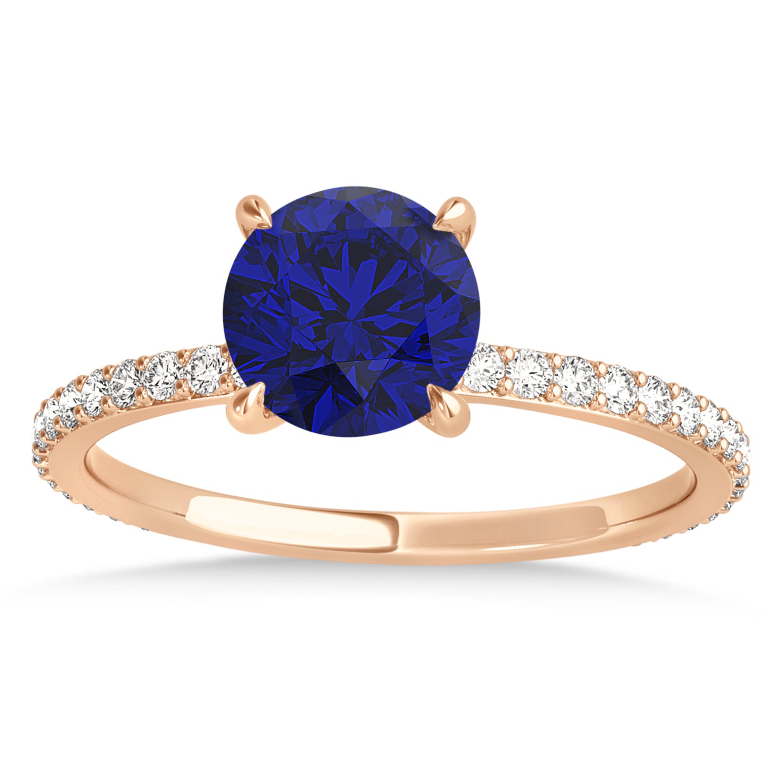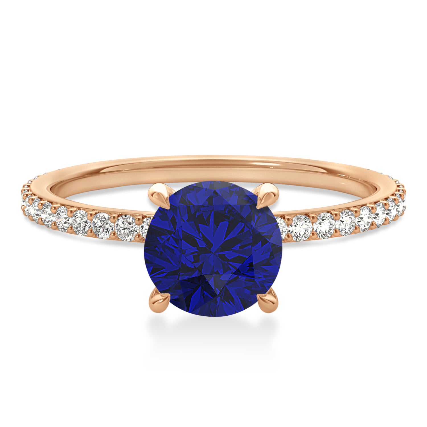 A 1.35 carat round-shaped Blue Sapphire is prong set into 14k Rose Gold in this preset hidden halo engagement ring. An abundance of prong diamond accents are featured in this ring that shine endlessly.