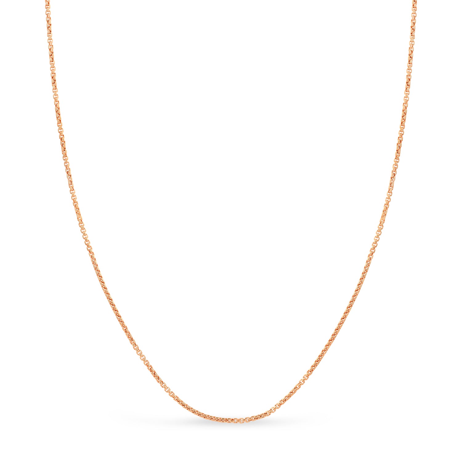 This box chain necklace is styled in 14K rose gold. The necklace secures with a secure lobster lock clasp.