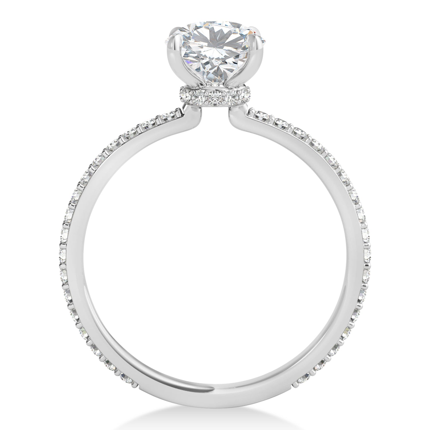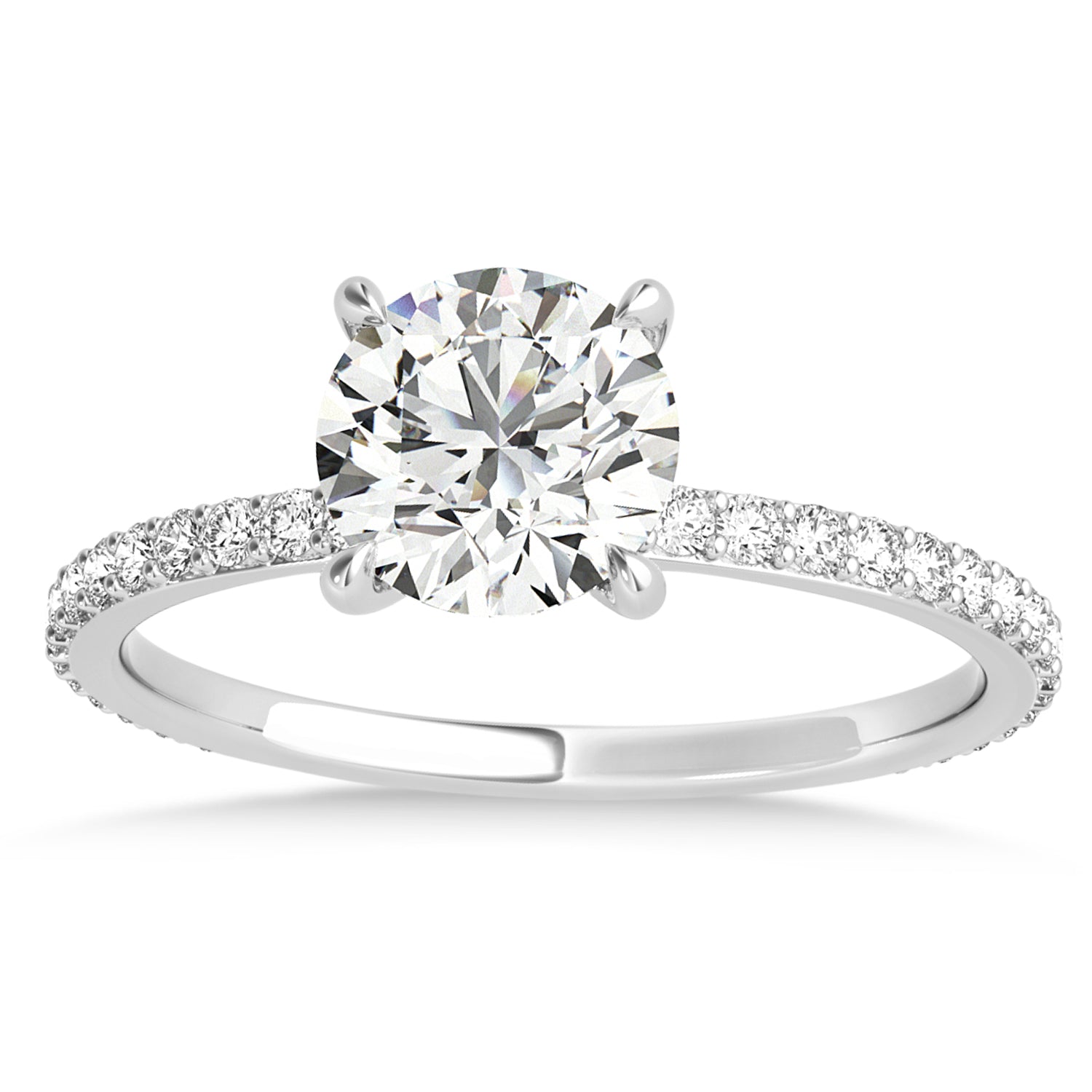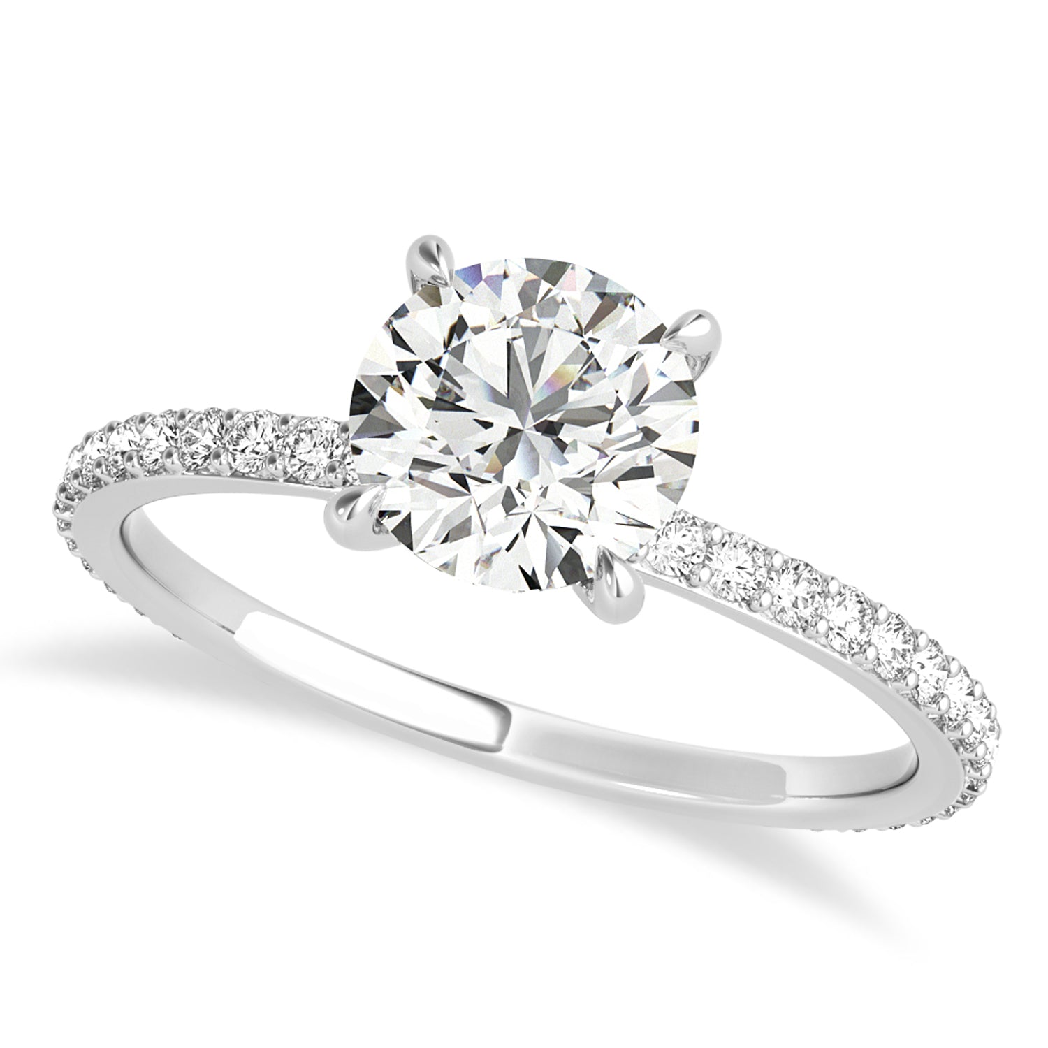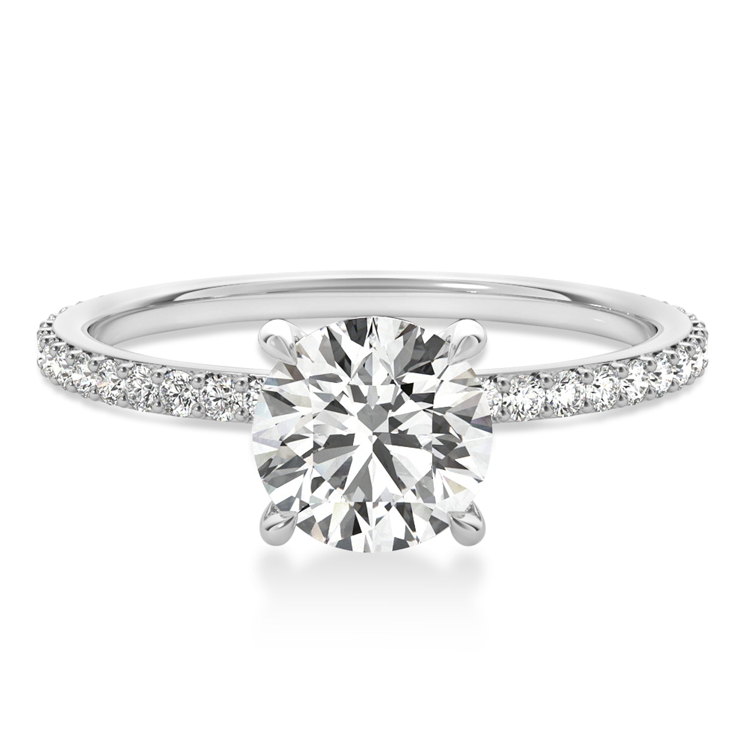 A 2.17 carat round-shaped diamond is prong set into 14k White Gold in this preset hidden halo engagement ring. An abundance of prong diamond accents are featured in this ring that shine endlessly.
