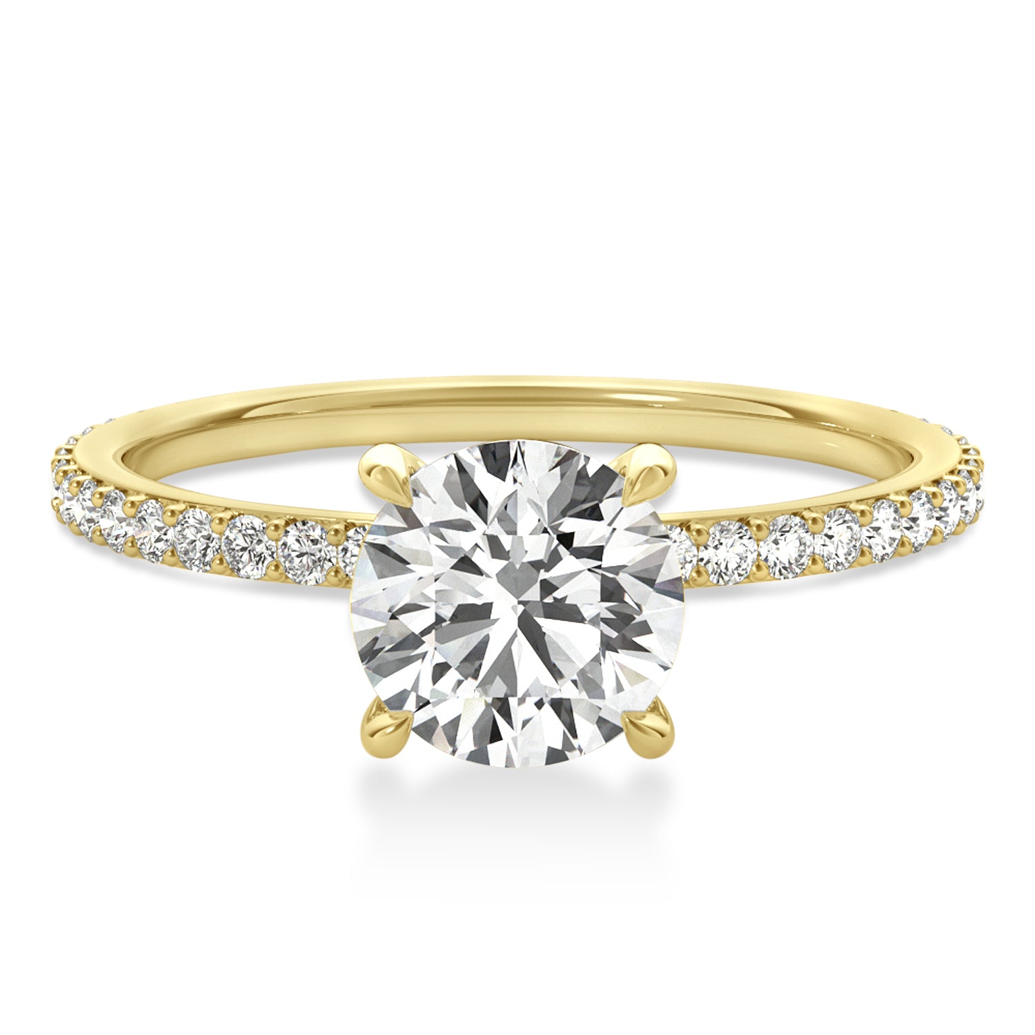 A 1.17 carat round-shaped diamond is prong set into 14k Yellow Gold in this preset hidden halo engagement ring. An abundance of prong diamond accents are featured in this ring that shine endlessly.