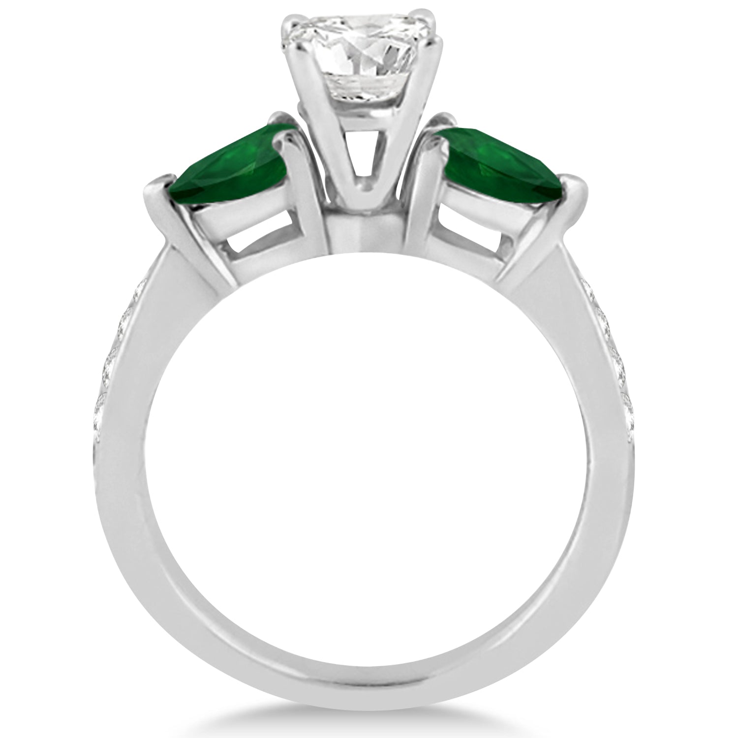 Dazzle her with this fancy three stone diamond and pear cut green emerald stone engagement ring which features green emerald gem stones and brilliant round diamonds.