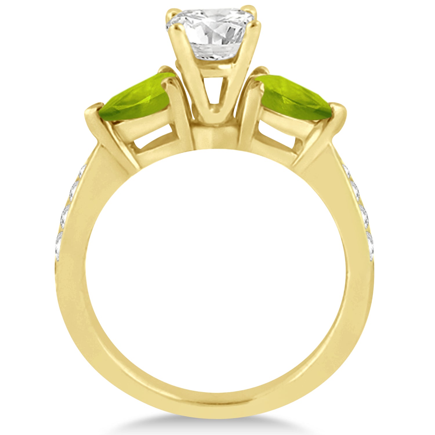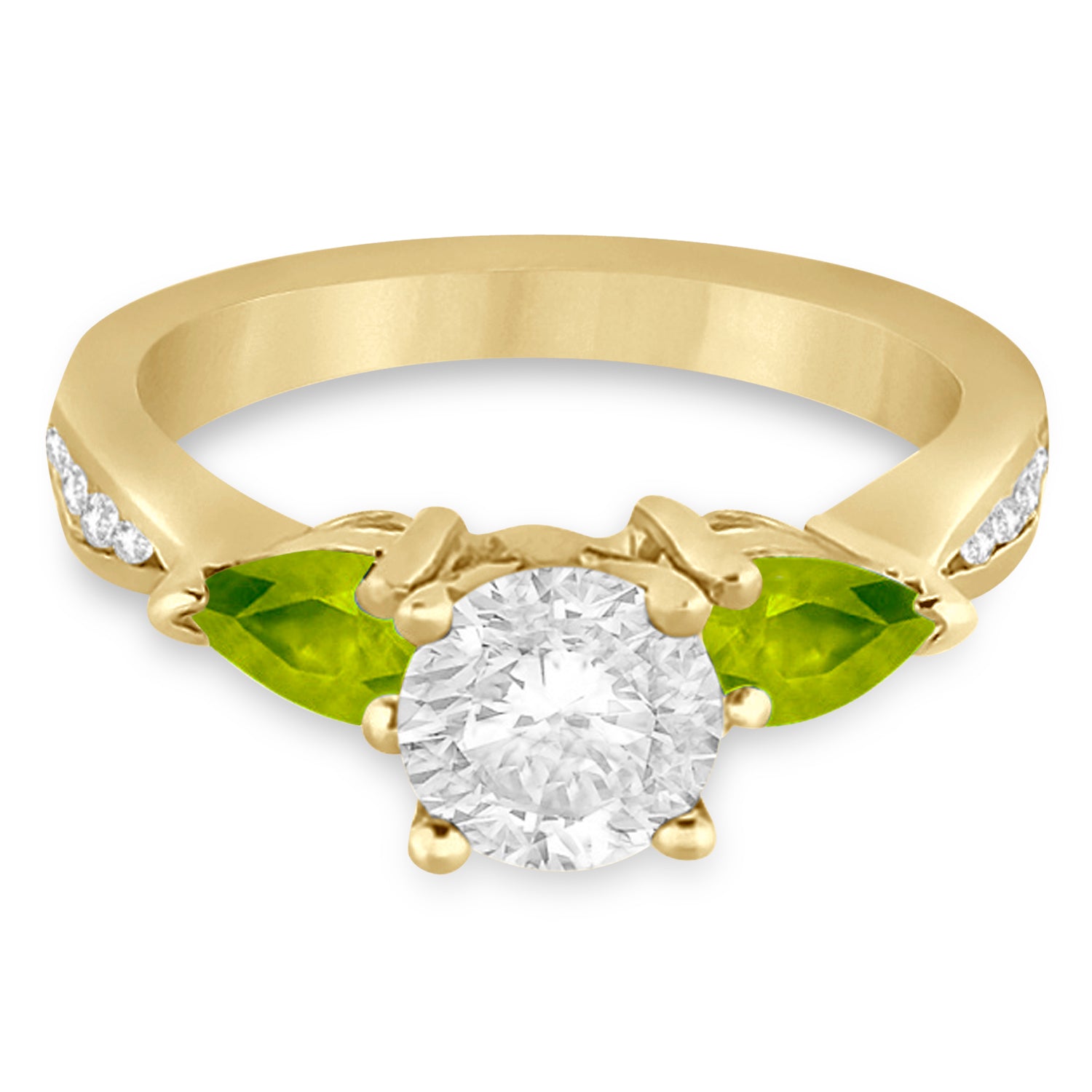 Dazzle her with this fancy three stone diamond and pear cut green peridot stone engagement ring which features green peridot gem stones and brilliant round diamonds.