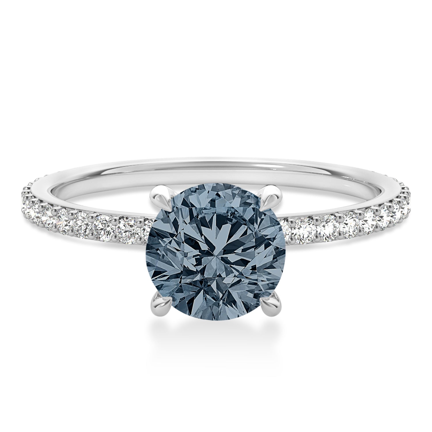 A 1.35 carat round-shaped Gray Spinel is prong set into Platinum in this preset hidden halo engagement ring. An abundance of prong diamond accents are featured in this ring that shine endlessly.