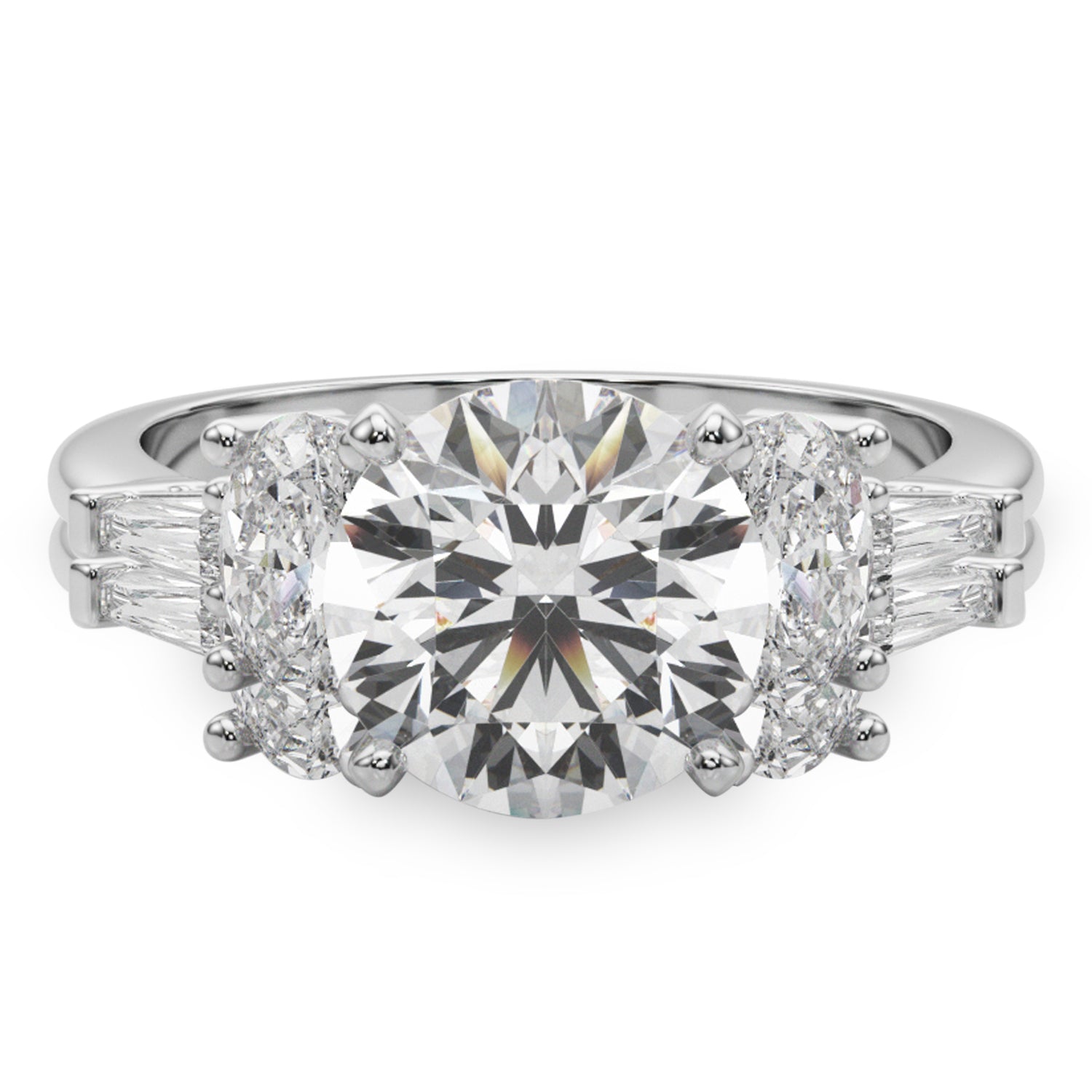 The centerpiece is a breathtaking 3-carat round diamond, measuring 9.4mm, surrounded by two oval 0.50-carat side stones (5.8x4.1mm) and two taper baguette 0.09-carat accent stones (4.02x1.5mm). And the exquisite Wedding Band piece showcases a stunning combination of a Straight Baguette (5x2.5), two radiant Oval stones (4x3), and two delicate Taper Baguettes (4x2x1.5)