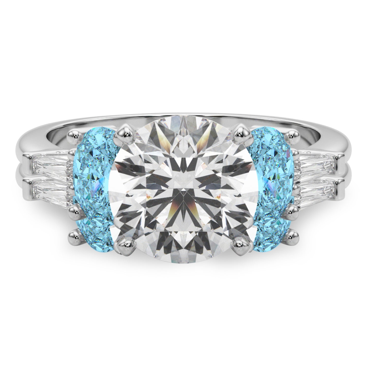 Discover the elegance of the Round Lab Grown Diamond & Oval Blue Topaz Bridal Set, meticulously crafted in 14K White Gold, showcasing a stunning 4.97-carat brilliance. The centerpiece is a breathtaking 3-carat round diamond, measuring 9.4mm, surrounded by two oval Blue Topaz 0.50-carat side stones (5.8x4.1mm) and two taper baguette 0.09-carat accent stones (4.02x1.5mm). The exquisite wedding band showcases a stunning combination of lab grown diamonds, including a Straight Baguette (5x2.5), two delicate Taper Baguettes (4x2x1.5) and two radiant Oval Blue Topazs stones (4x3).