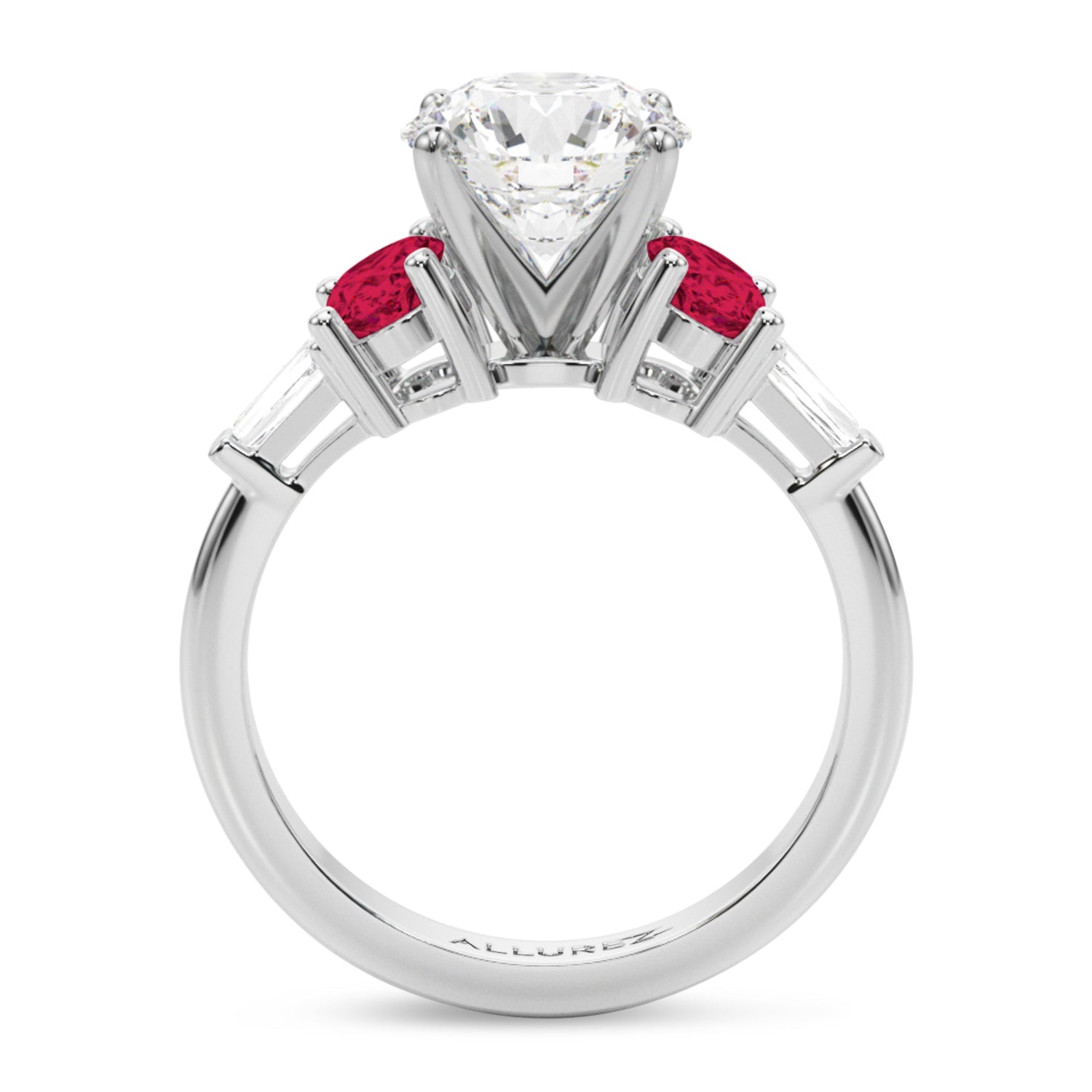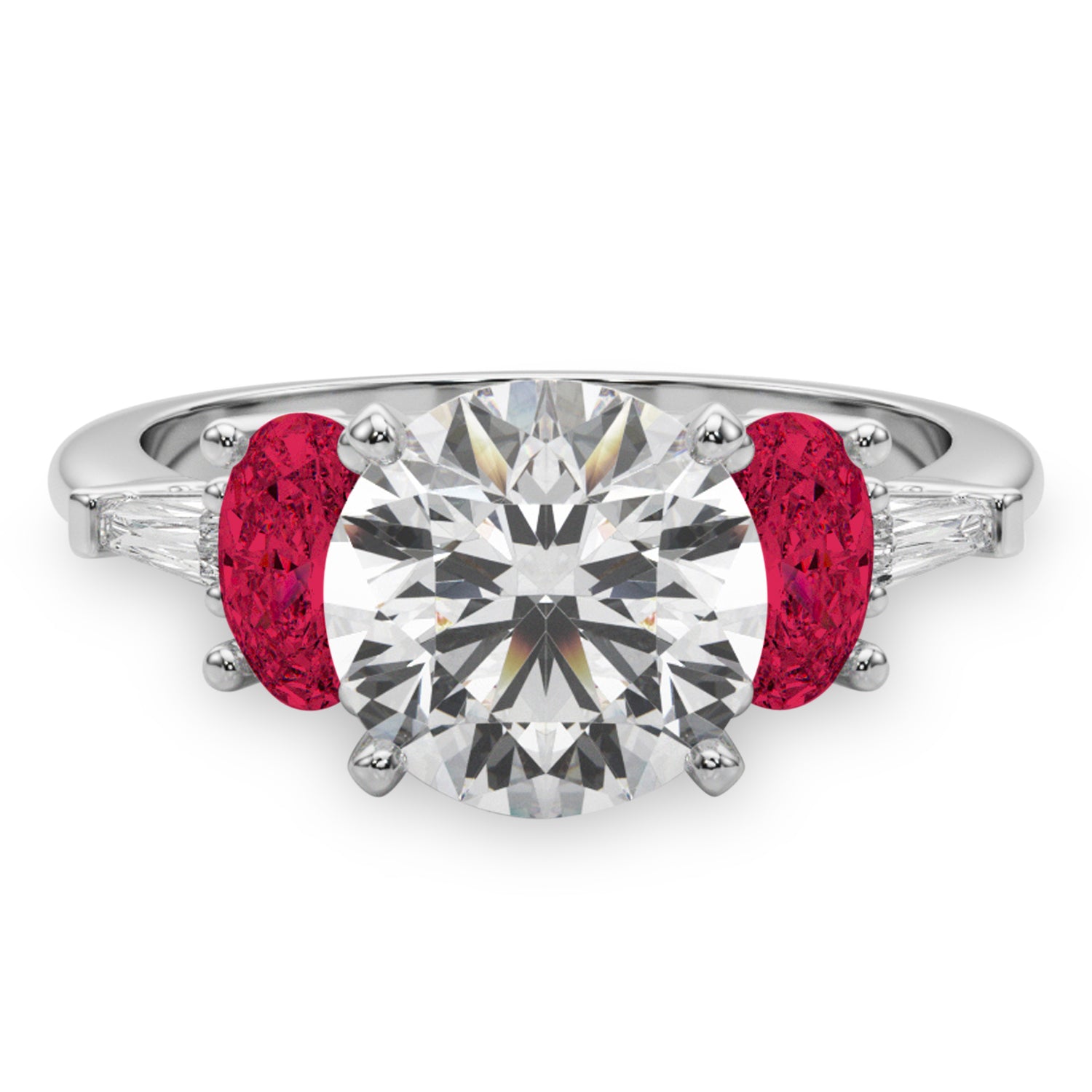 Discover the elegance of the Round Lab Grown Diamond & Oval Ruby Engagement Ring, meticulously crafted in 14K White Gold, showcasing a stunning 4.24-carat brilliance. The centerpiece is a breathtaking 3-carat round diamond, measuring 9.4mm, surrounded by two oval Ruby 0.53-carat side stones (5.8x4.1mm) and two taper baguette 0.09-carat accent stones (4.02x1.5mm).