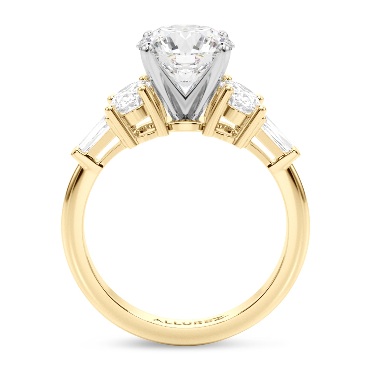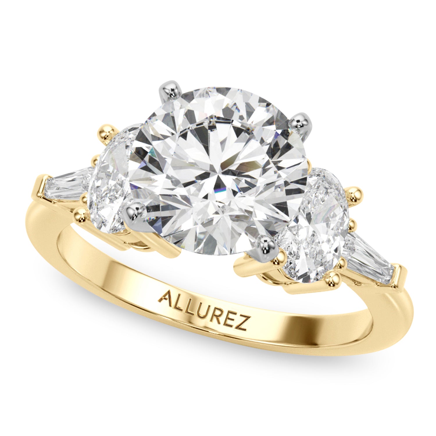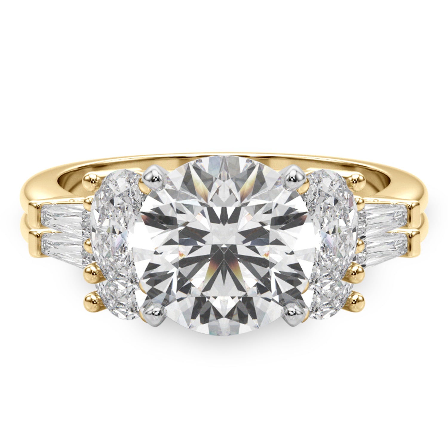 The centerpiece is a breathtaking 3-carat round moissanite diamond, measuring 9.4mm, surrounded by two oval 0.50-carat lab grown diamond side stones (5.8x4.1mm) and two taper baguette 0.09-carat lab grown diamond accent stones (4.02x1.5mm). And the exquisite Wedding Band piece showcases a stunning combination of a Straight Baguette (5x2.5), two radiant Oval stones (4x3), and two delicate Taper Baguettes (4x2x1.5)