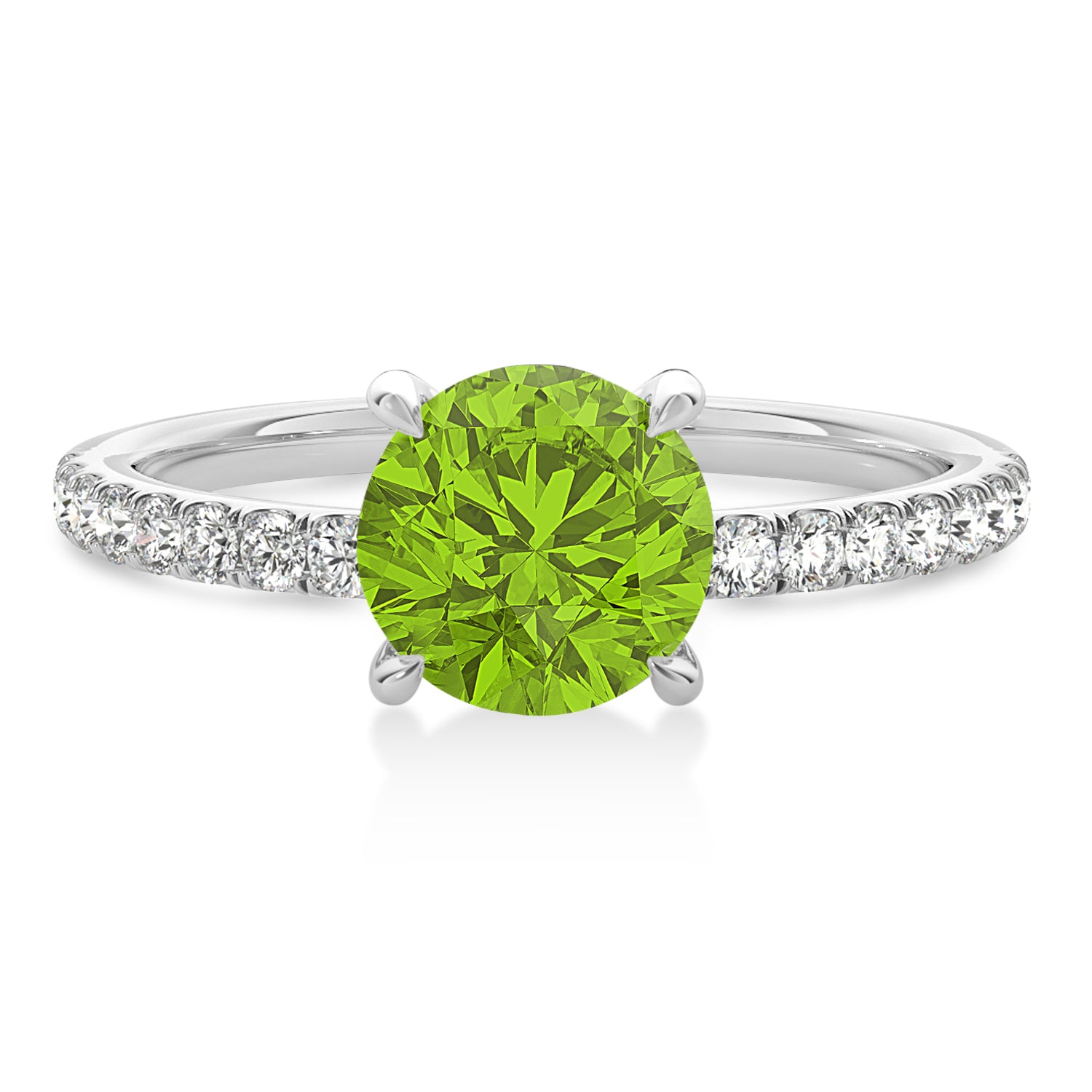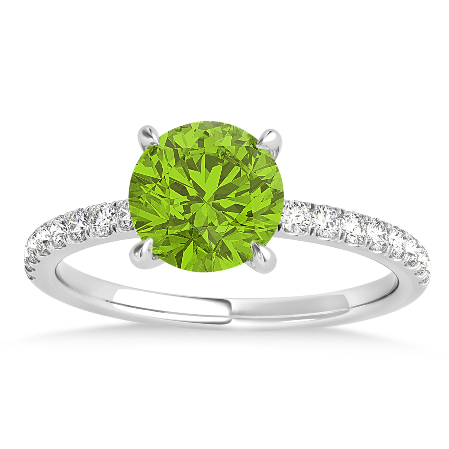 A 1.00 carat round-shaped Peridot is prong set into 18k White Gold in this preset hidden halo engagement ring. An abundance of prong diamond accents are featured in this ring that shine endlessly.
