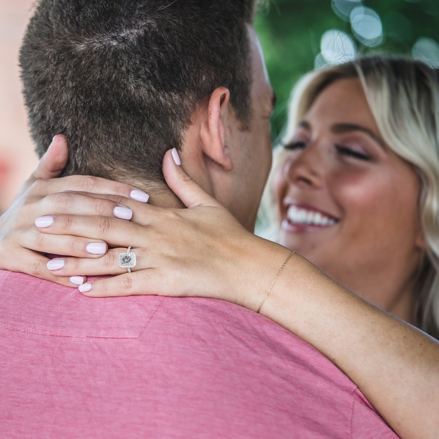 The stone is surrounded by 38 G-H color, SI1-SI2 quality diamonds totaling 0.57ct in weight.