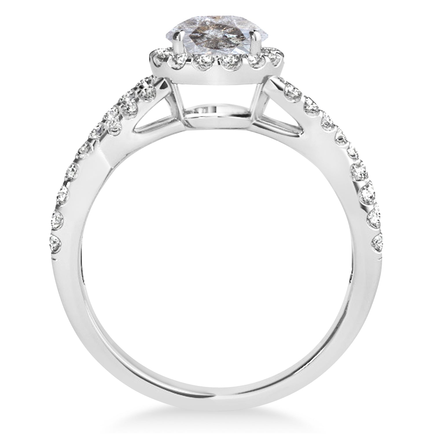 Set in 14k white gold, this preset salt & pepper diamond & diamond engagement ring features a hand chosen center stone as well as stunning side stones accenting the halo and the infinity ring's shank.