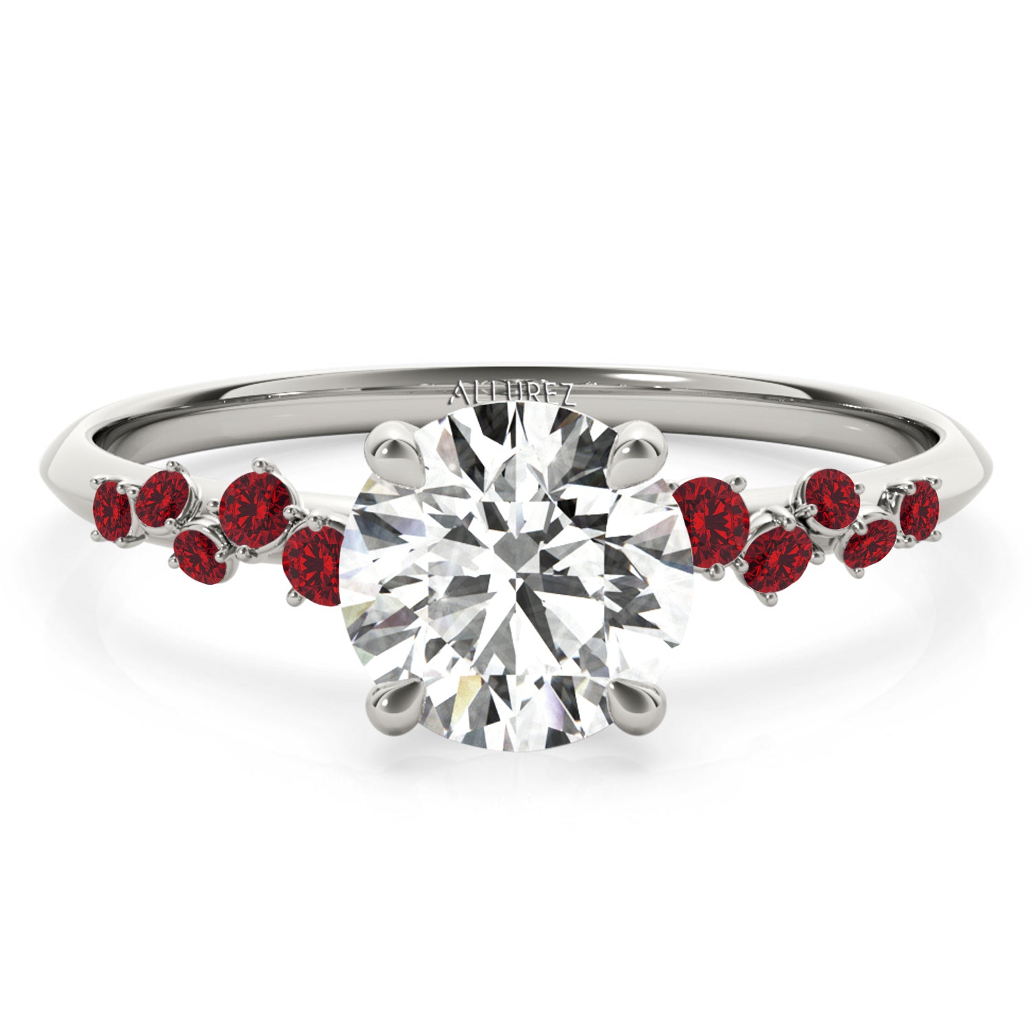 Introducing our stunning Diamond & Scattered Ruby Engagement Ring, meticulously crafted in 14K White Gold. This exquisite ring features a breathtaking center stone of your choice, complemented by round Ruby side stones totaling 0.13 carat. Its a mesmerizing symbol of love and sophistication.