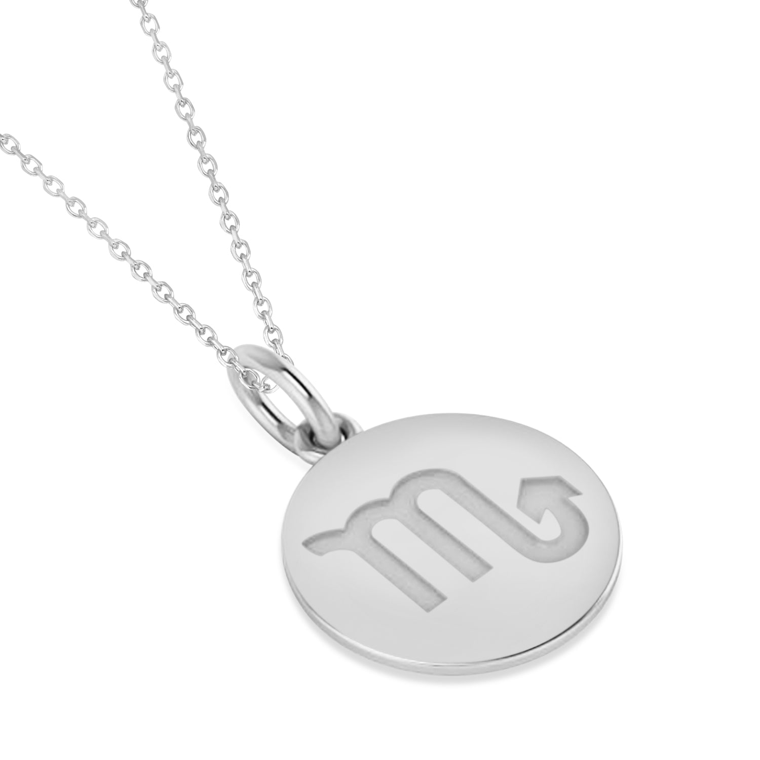 Our Scorpio Disk Zodiac pendant necklace is also available in other metals. We also offer these pendant necklaces in the eleven other Zodiac signs.