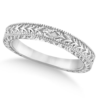 This fancy carved vintage solitaire engagement ring with matching band features antique style scroll work and milgrained edges. The antique designer bridal set comes in an elegant 18kt White Gold setting.