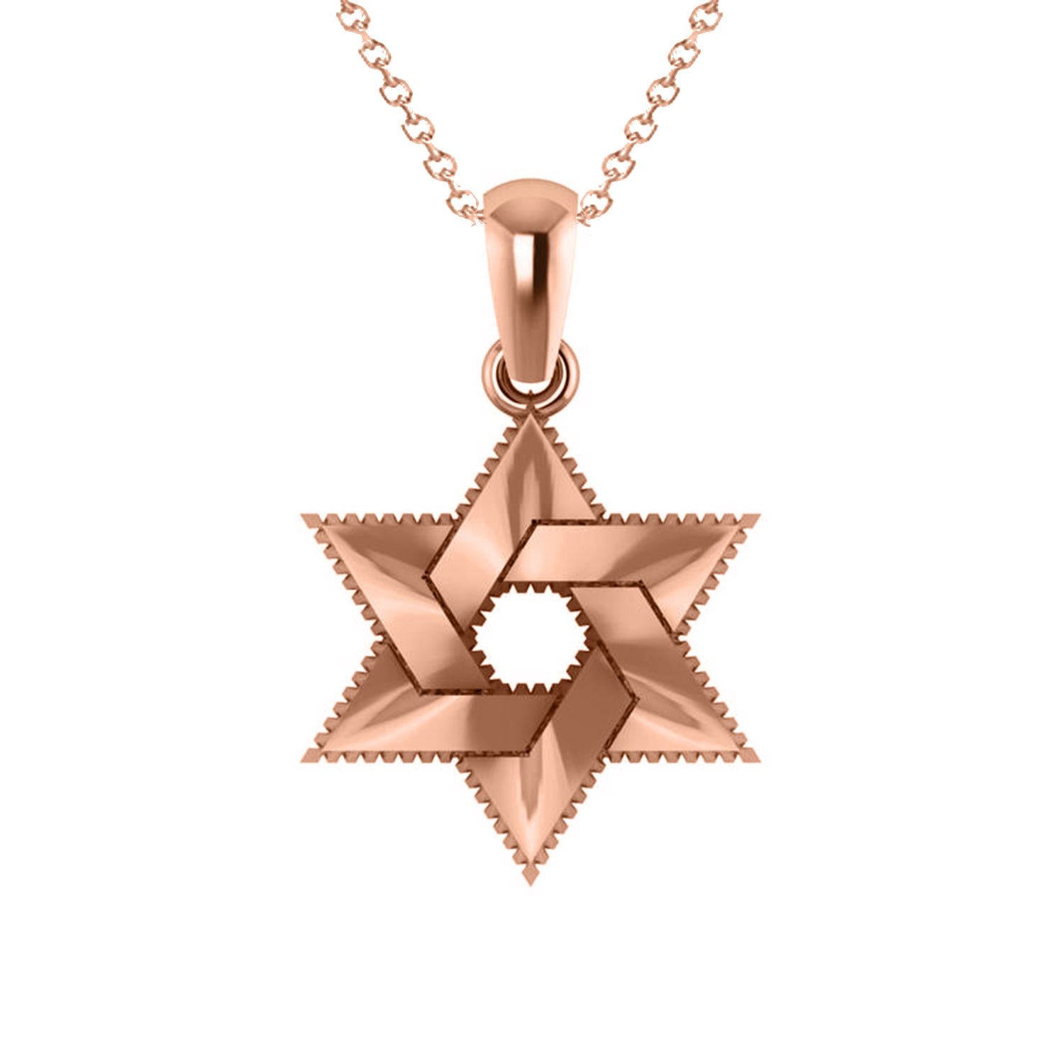 Our Star of David Pendant Necklace features intertwining triangles in 14K rose gold and comes suspended a 16" or 18" long matching chain at no additional charge.