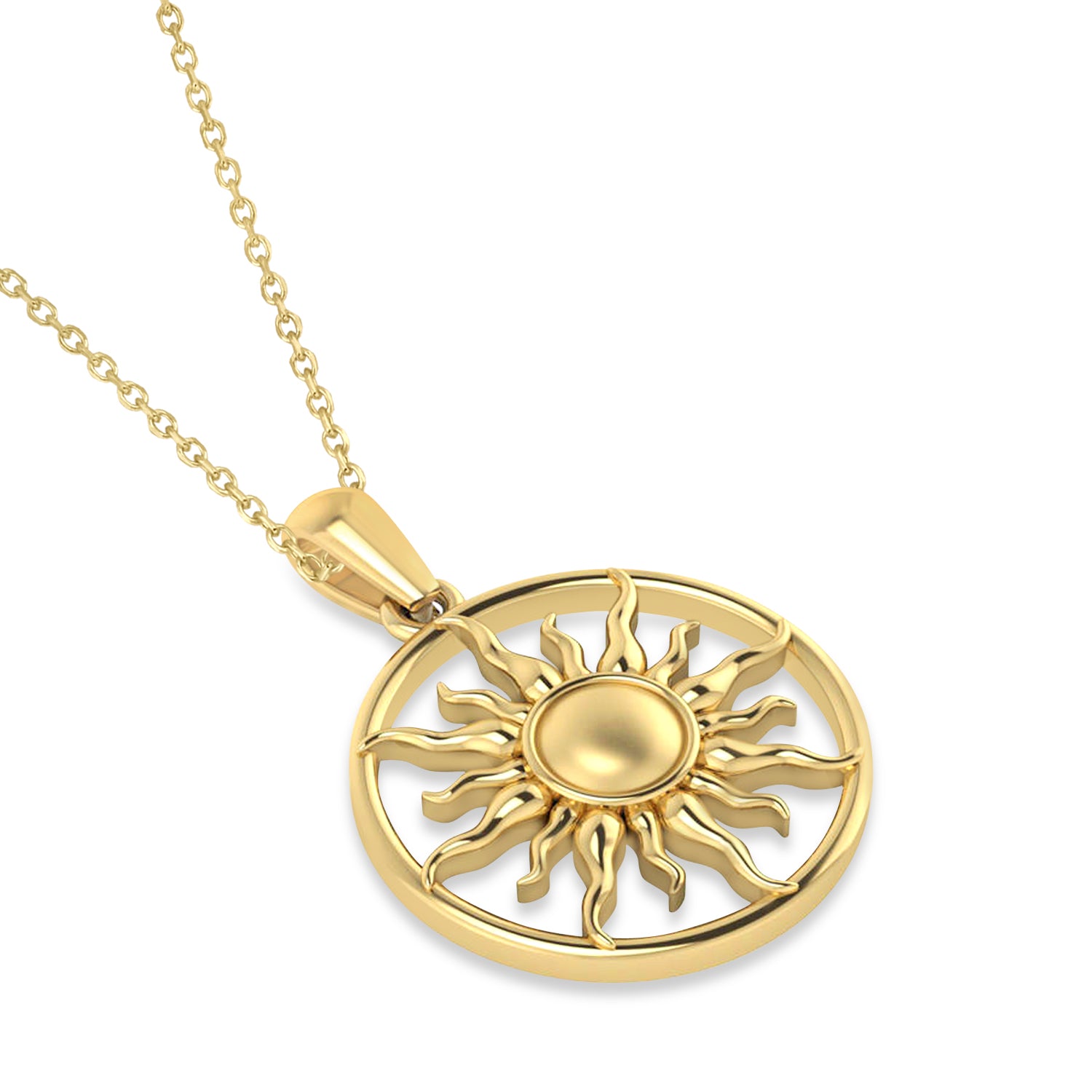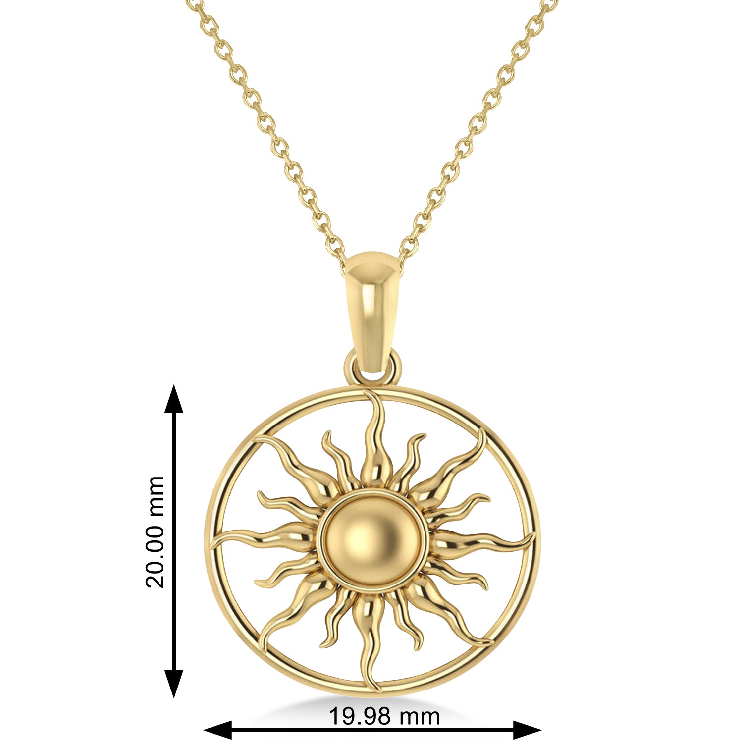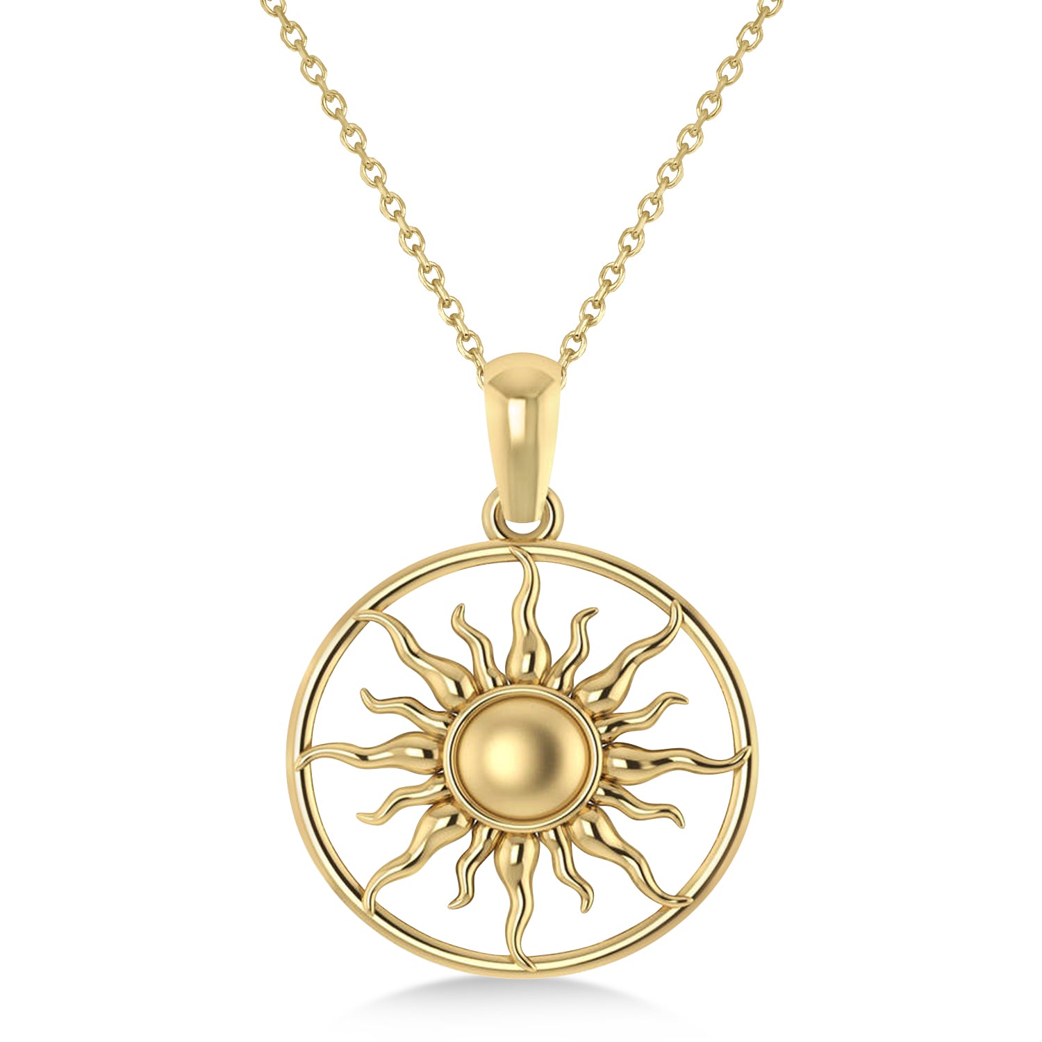 This pendant necklace features a sunburst enclosed in a circle. Crafted in 14k yellow gold, this sun necklace will help give you that sunshine summer time feeling.