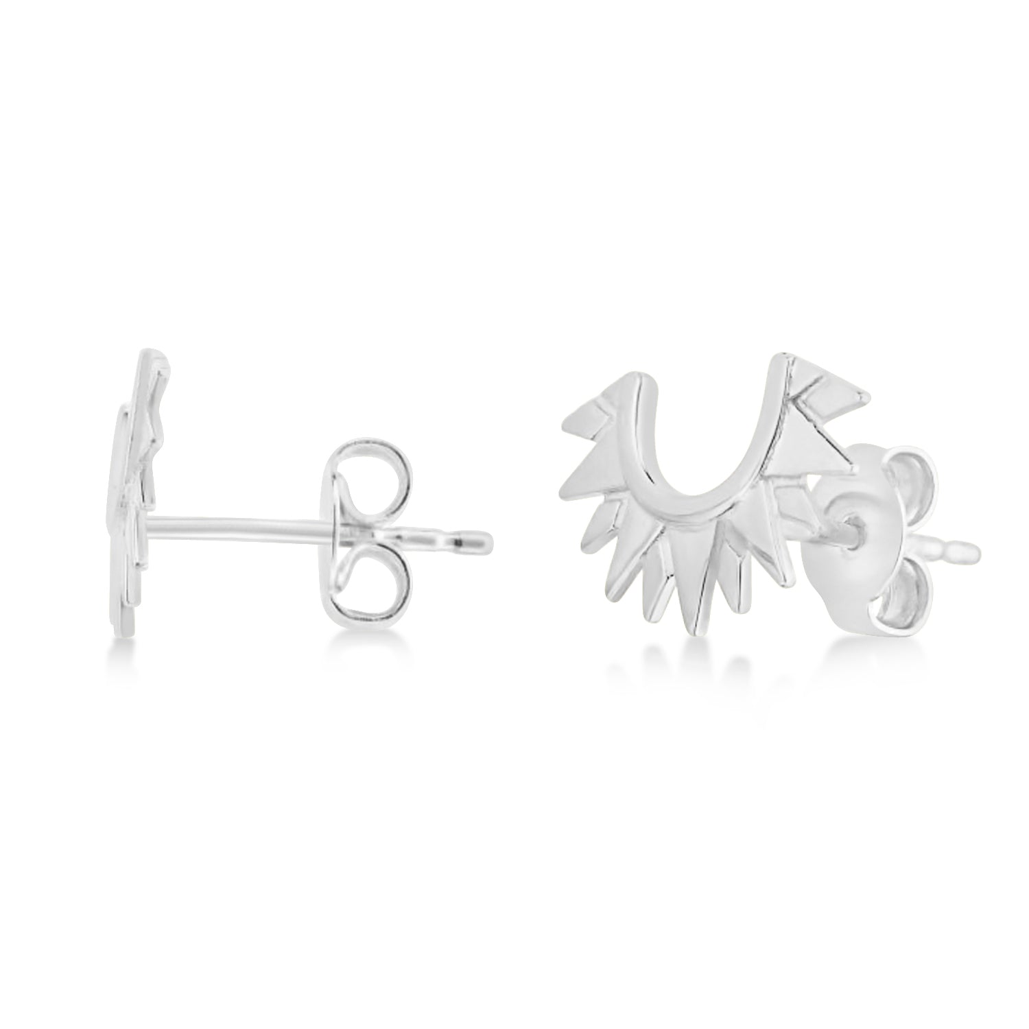 Shine like the sun while wearing these suburst shaped stud earrings in 14k white gold, featuring eleven sun rays on each ear. A push back closure holds each earring securely in place. These earrings are also available with diamonds accenting the sunburst.