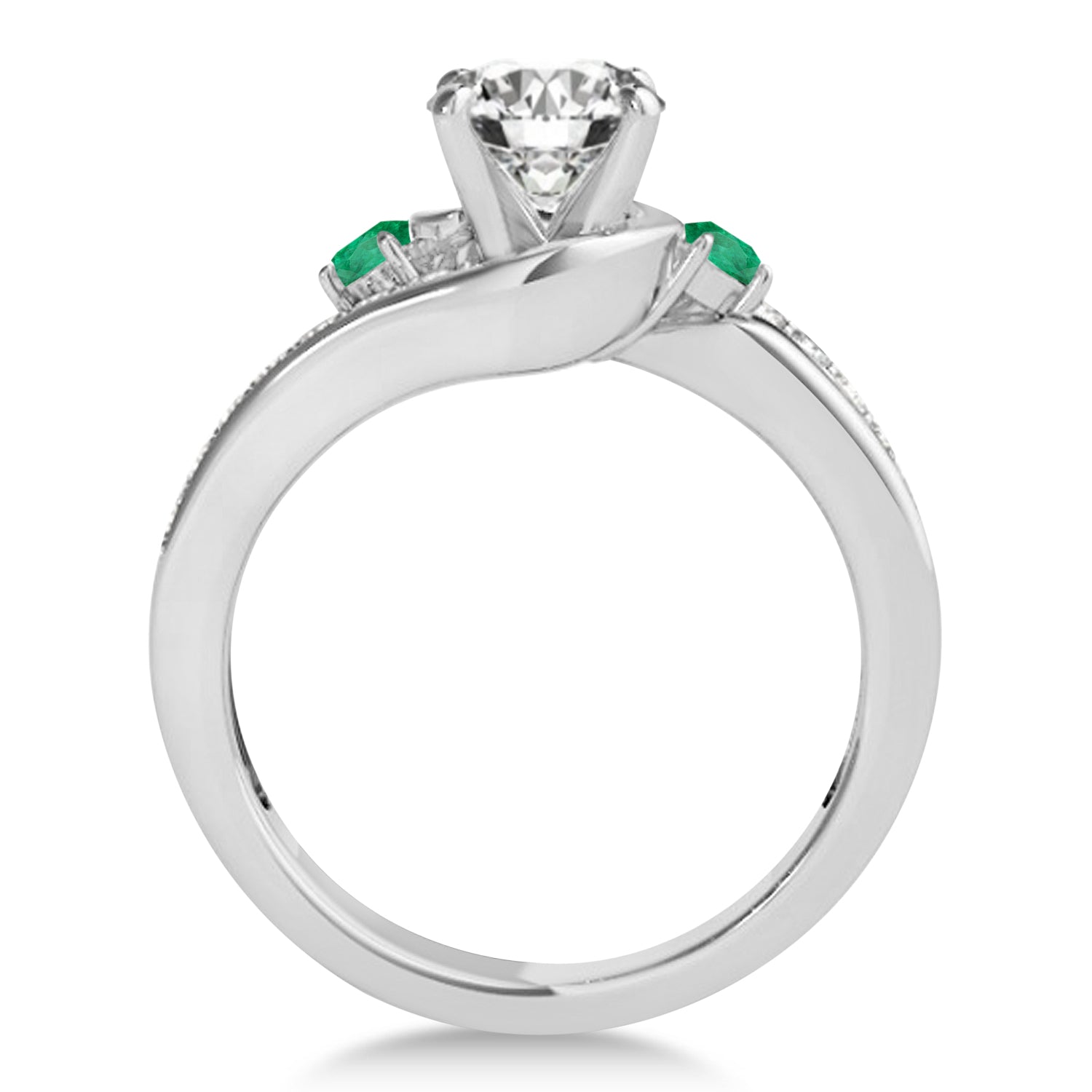 This emerald/diamond engagement ring setting dazzles in 18k white gold. It's no wonder, after all this twisted setting holds 18 individually prong set diamonds and 2 emeralds. With two swirls of side stones and twisted accents, this diamond engagement ring setting features around 0.38 total carats.