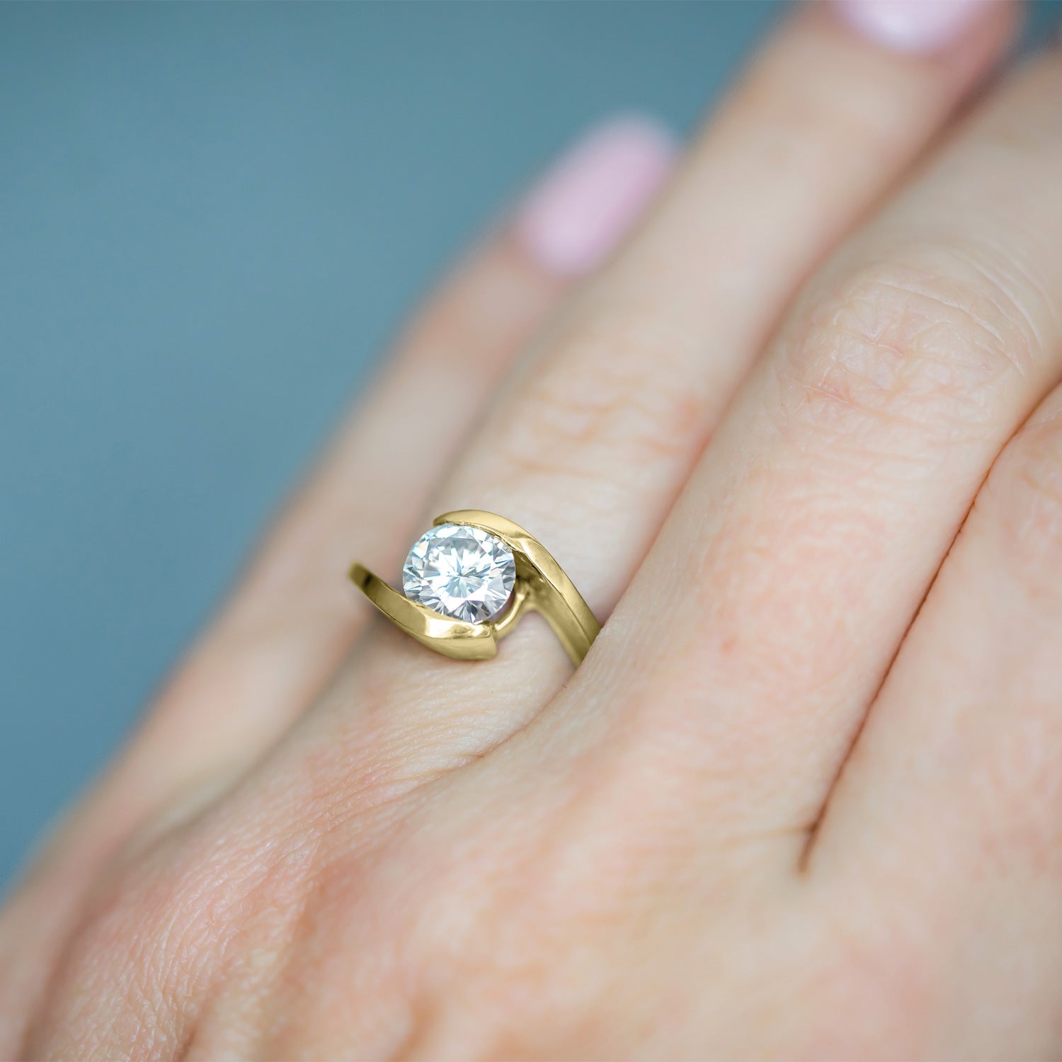 This 14k yellow gold, tension set solitaire lab grown diamond engagement ring features an unusual twisted design that holds a single, hand chosen, preset stone of approximately three quarters of a carat.