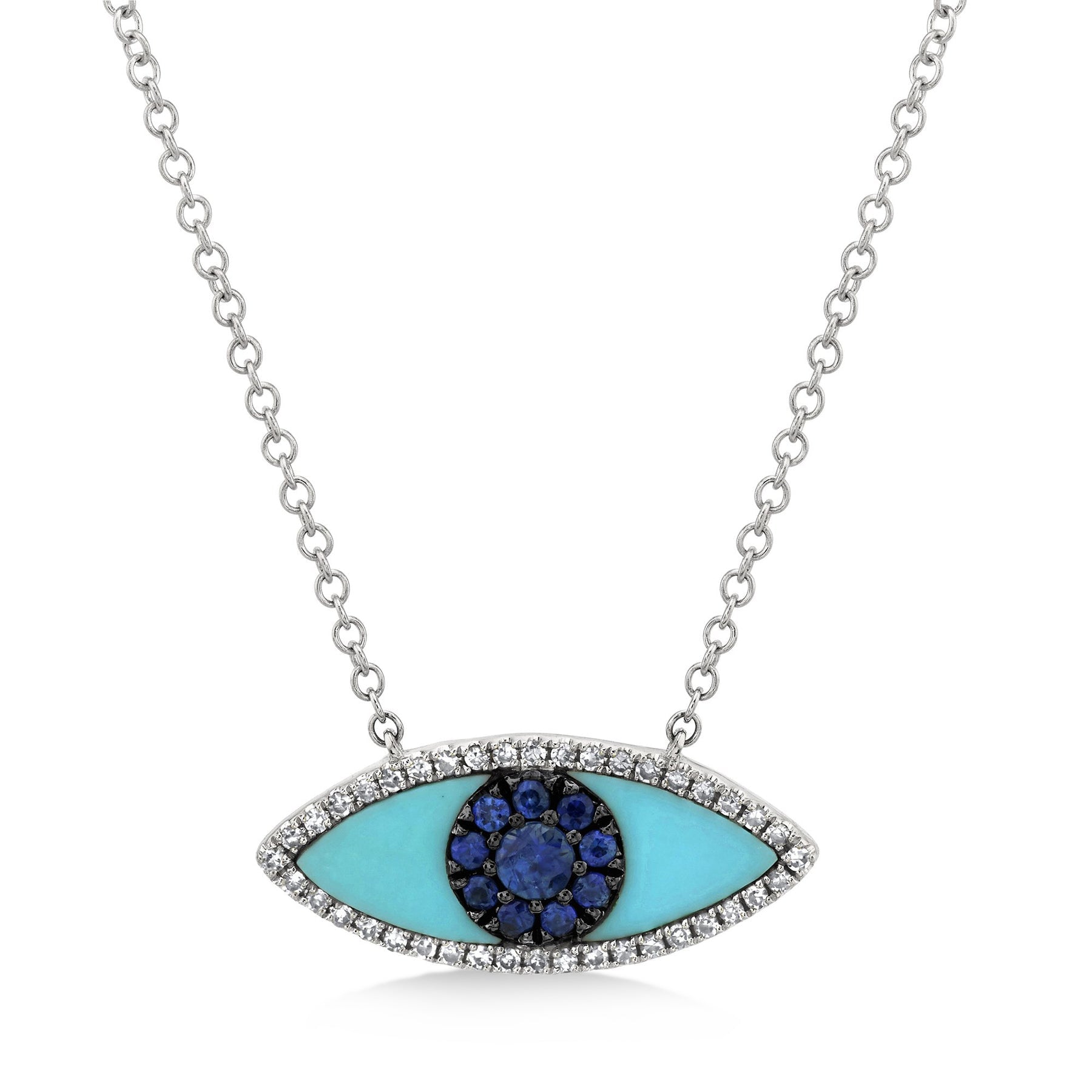 Turquoise & Blue Sapphire & Diamond Evil Eye Pendant Necklace 14k Whit