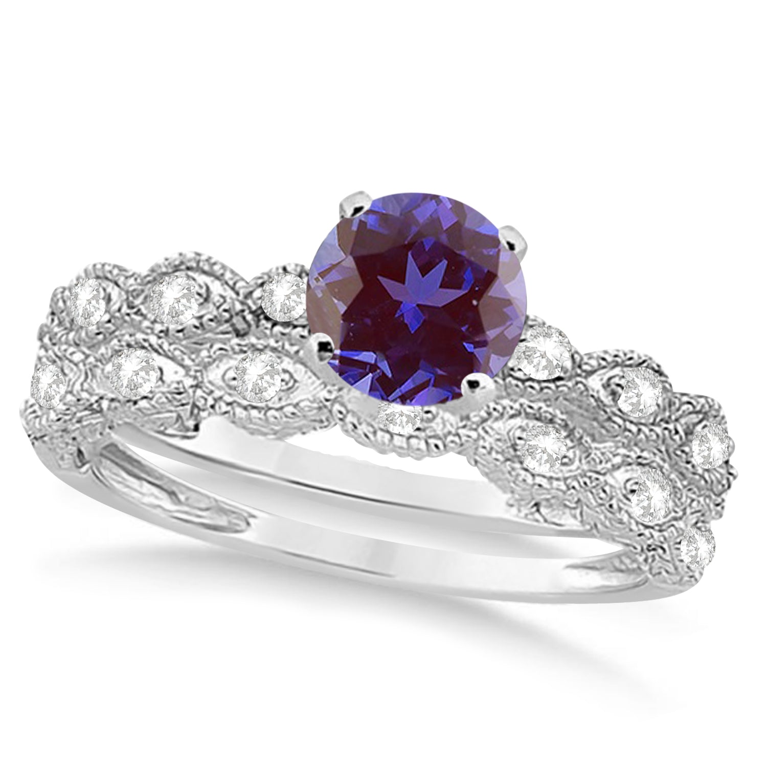 Vintage Alexandrite & Diamond Engagement Ring Bridal Set 14k White Gold (1.36ct)